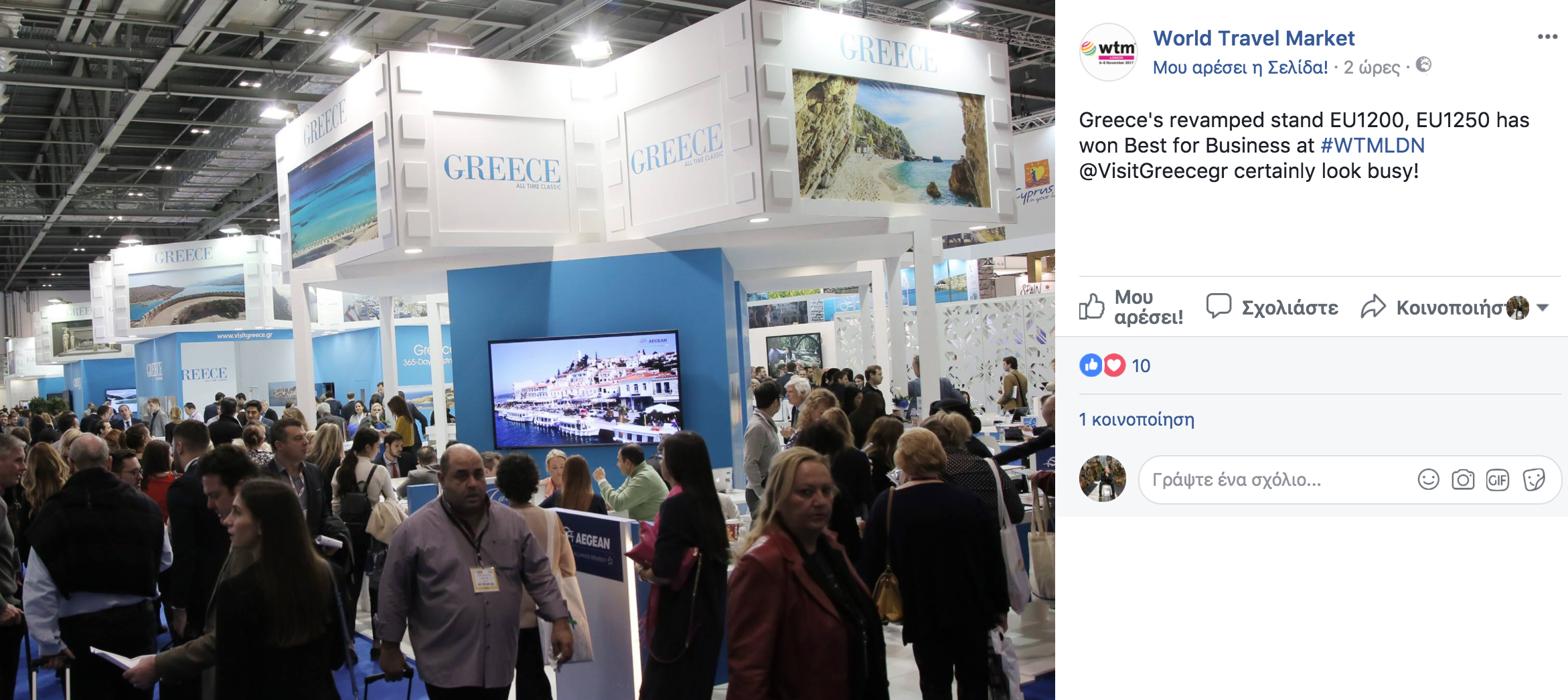 H Ελλάδα και ο ΕΟΤ βραβεύτηκαν στη Διεθνή Τουριστική Έκθεση του Λονδίνου, WorldTravelMarket 2017 για το καλύτερο περίπτερο, που ξεχώρισε για τη μεγάλη επισκεψιμότητα και τις επαγγελματικές επαφές. Το βραβείο “Best Stand for Doing Business” παρέλαβε από τους διοργανωτές της έκθεσης ο γενικός γραμματέας του ΕΟΤ, Κωνσταντίνος Τσέγας και η επικεφαλής του ΕΟΤ Μεγάλης Βρετανίας Έμυ Αναγνωστοπούλου. Η βράβευση αυτή, όπως τονίζεται στην ανακοίνωση του υπουργείου, αποτυπώνει το υψηλό ενδιαφέρον για την Ελλάδα από παράγοντες των ξένων τουριστικών αγορών που επισκέπτονται και πραγματοποιούν επαφές και συναντήσεις με τους Έλληνες εκθέτες που φιλοξενεί το ελληνικό περίπτερο. Η υπουργός Τουρισμού Έλενα Κουντουρά με τον γενικό γραμματέα του ΕΟΤ κ. Τσέγα πραγματοποιούν μεγάλο αριθμό επαγγελματικών συναντήσεων για την προώθηση και προβολή του ελληνικού τουριστικού προϊόντος στη Μεγάλη Βρετανία και την ανάδειξη της Ελλάδας ως παγκόσμιου ελκυστικού προορισμού 365 ημέρες το χρόνο. Στο περίπτερο του ΕΟΤ συμμετέχουν 70 εκθέτες από την Ελλάδα.