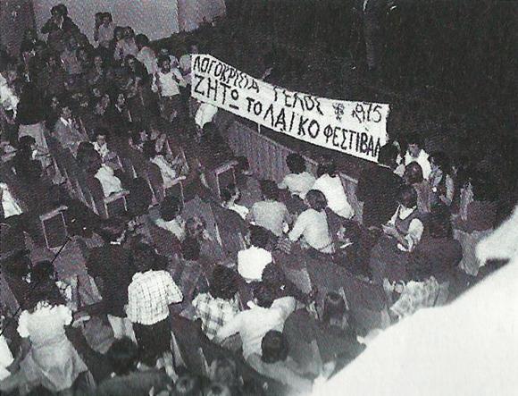 1989: Ο Μίμης Πλέσσας εγκαινιάζει το φεστιβάλ με το πιάνο του και η βραδιά συνεχίζεται στους κήπους του κυβερνείου, με τις κακές γλώσσες να μαρτυρούν πως θαμώνες της δεξίωσης μη βρίσκοντας χαρτοπετσέτες στο μπουφέ άφησαν τα δαχτυλικά τους αποτυπώματα στα λευκά τραπεζομάντηλα…Τα βασικά βραβεία δεν απονέμονται ως αντίδραση για τη κατάσταση του ελληνικού σινεμά.