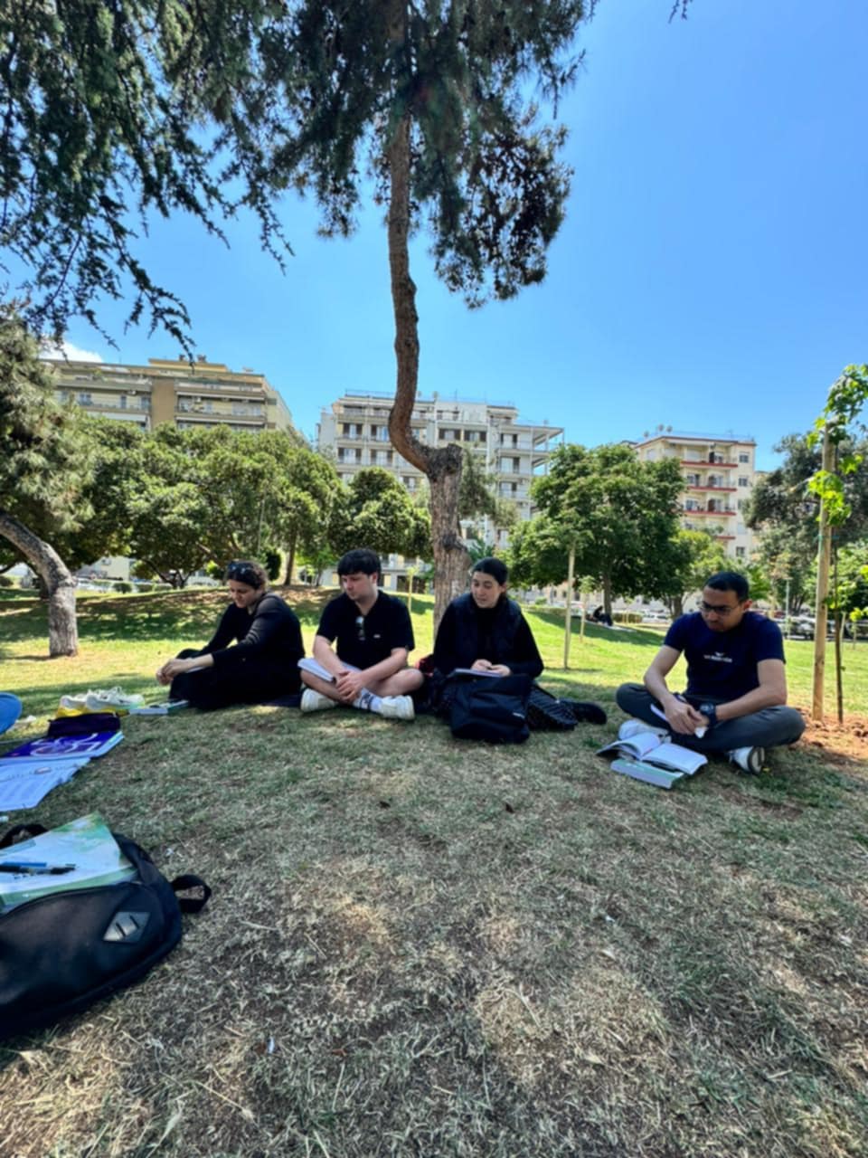 Πάρκο του Ηρακλειώτη. Είναι τέσσερις παρά τέταρτο το απογευματάκι, το μάθημά μας στο πάρκο έφτασε στο τέλος του. Τα μαζεύουμε και οδεύουμε στην έξοδο, με βήμα αργό σαν να μη θέλουμε να αφήσουμε την ανοιχτή/φυσική μας αίθουσα. Δεν λένε να ξεκολλήσουν μερικοί από το πηγαδάκι μας έξω στο πεζοδρόμιο. Αρχίσαμε κουβέντες για λέμε για ταξίδια, εμπειρίες κλπ. Όλοι χαμογελαστοί, ξεκούραστοι μετά από ένα τετράωρο μάθημα εκεί στο πάρκο.
