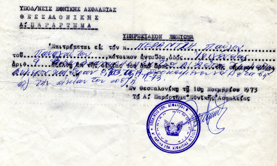 Στον έρημο σιδηροδρομικό σταθμό της Θεσσαλονίκης, περασμένα μεσάνυχτα, συλλαμβάνουν κι άλλους. Τους επιβιβάζουν σ΄ ένα ΡΕΟ. Πάλι τη γλύτωσα. Η καρδιά μου χτυπάει δυνατά. Αλλά όχι, δεν θα τους αφήσουμε να κάνουν ό,τι θέλουν. Φτάνω σπίτι με ταξί και τη συνοδεία αστυνομικού. Όπως όλοι οι λιγοστοί επιβάτες.