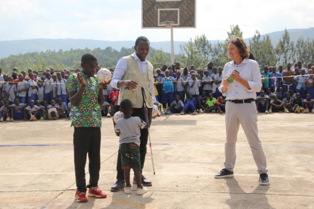 Με λίγες ώρες ύπνου, η πρώτη ημέρα ξεκίνησε από τα γραφεία της UNICEF. Είναι απίστευτο συναίσθημα να αγαπούν την ιδέα σου σε άλλες χώρες και να την αναδεικνύουν ως καλή πρακτική. Σχεδιάσαμε τα επόμενα βήματα και ξεκινήσαμε για το πεδίο, ένα σχολείο 1.150 μαθητών και μαθητριών στα σύνορα με την Ουγκάντα. Η Ρουάντα είναι ίσως η μοναδική χώρα της Αφρικής που εφαρμόζει συμπεριληπτική πολιτική στα σχολεία όπως και η Ελλάδα. Μόλις φτάσαμε μετά από 3,5 ώρες οδηγώντας σε αυτοκινητόδρομο αλλά κυρίως σε αγροτικούς δρόμους, μας περίμενε και μια μητέρα με τον 5χρονο Ντάμας. Ο μικρός γεννήθηκε σε οικογένεια βλεπόντων αλλά πρόωρα και έχασε την όρασή του ολικά στη θερμοκοιτίδα. Είπα στον Τζόναθαν της UNICEF, να φέρει την πρώτη μπάλα πριν ξεκινήσει η βιωματική συμπεριληπτική δράση για όλο το σχολείο. Τότε, γίναμε μάρτυρες μια ιστορίας γραμμένη σε παραμύθια: Ο Ντάμας μόλις άκουσε να κουδουνίζει η μπάλα στα χέρια του Τζόναθαν, άφησε το χέρι της μητέρας του και κατευθύνθηκε σα μαγεμένος προς τη μπάλα χωρίς το μπαστούνι του. Όταν αγκάλιασε τη μπάλα, φώναξε στη μητέρα του ότι αυτή η μπάλα είναι για εμένα.