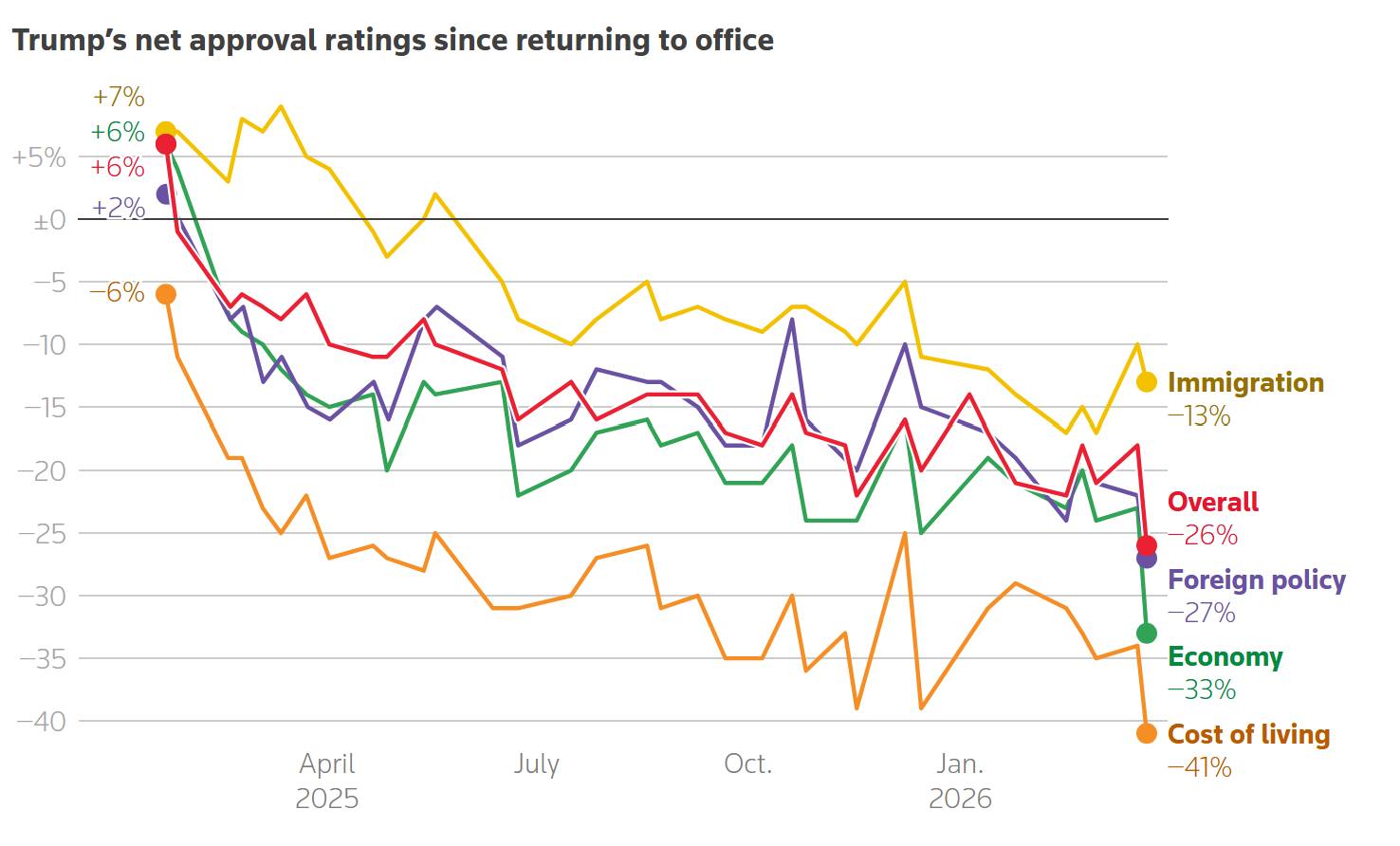 Αν δούμε την εξέλιξη των ποσοστών καθαρής αποδοχής του Τραμπ από την αρχή της θητείας του (όπου βρίσκονταν περίπου σε +5% έως +6% στα περισσότερα ζητήματα), η εικόνα είναι αυτή μιας γενικευμένης και βαθιάς καθοδικής μετατόπισης: