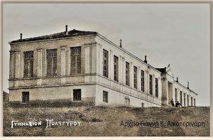 (σημ. Το κτίριο του Γυμνασίου Πολυγύρου που κατεδαφίστηκε επί δικτατορίας, ήταν έργο του Χαλκιδικιώτη αρχιτέκτονα Ξενοφώντα Παιονίδη. Μεταξύ των άλλων είχε εκπονήσει και τις μελέτες του Παπάφειου ορφανοτροφείου στη Θεσσαλονίκη, το Λάππειο γυμνάσιο στη Νάουσα, το Διοκητήριο στις Σέρρες, την αποκατάσταση του μητροπολιτικού ναού Γρηγορίου Παλαμά στη Θεσσαλονίκη κ.ά.)