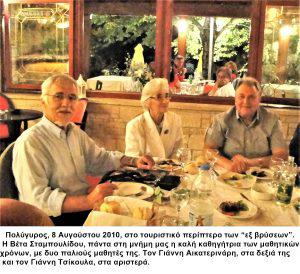 Όπως κι άλλοι μαθητές της, συνέχισα κι εγώ να την συναντώ και μετά τα γυμνασιακά μας χρόνια και πολύ περισσότερο στα δύσκολα της δικτατορίας. Καθώς τότε σχεδίαζα την κατοικία τους στην Τούμπα, στην οδό Ανατολικής Θράκης, ανταμώναμε συχνότερα με τη σπουδαία φιλόλογο Βέτα Σταμπουλίδου και τον μεγάλο μας Πολυγυρινό ζωγράφο Φώνη Ζογλοπίτη. Θυμάμαι ακόμη ότι σε μια από τις ατέλειωτες συζητήσεις για τον πολιτισμό, τις τέχνες και την ανάγκη εμπέδωσης της δημοκρατίας στη χώρα μας, παρευρίσκονταν και ο μεγάλος μας αρχαιολόγος Μανόλης Ανδρόνικος. Λίγα χρόνια νωρίτερα του είχα σχεδιάσει ένα τζάκι στο διαμέρισμά του που βρίσκονταν σε πολυκατοικία λίγο παρέκει, στην οδό Παπάφη. Άλλη μια φορά η συζήτηση άναψε για τα καλά με τον Ντίνο Χριστιανόπουλο στο χώρο της «Διαγωνίου», μέσα στη στοά Χρυσικοπούλου, αν θυμάμαι καλά.