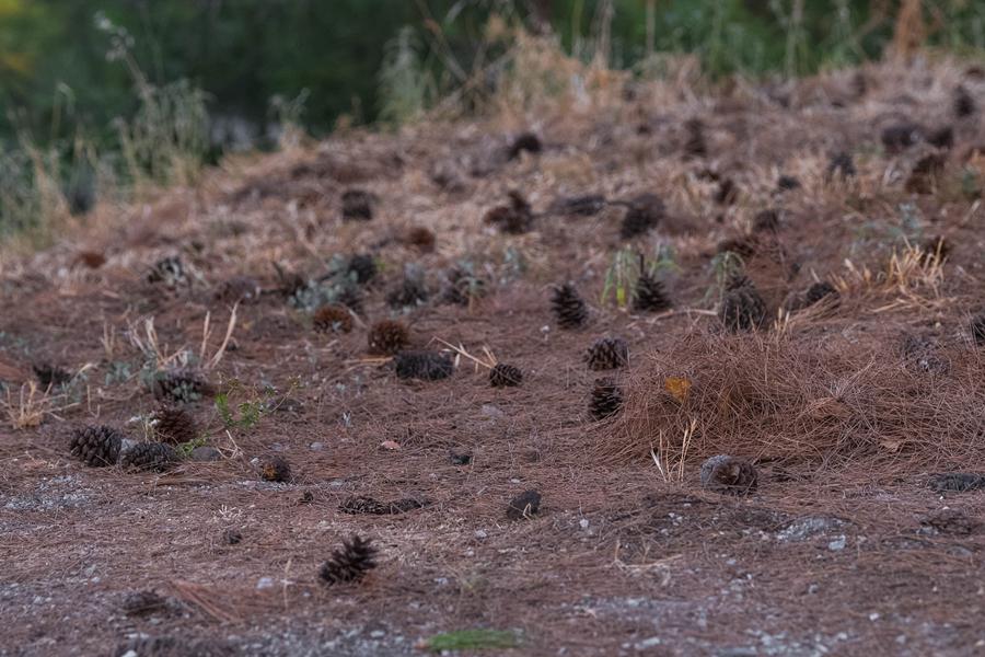 Ξερά κουκουνάρια και ξερές πευκοβελόνες έξω από αυλές σπιτιών στην Πυλαία.