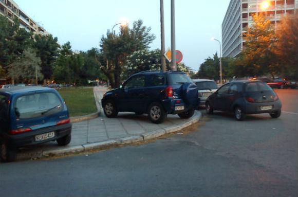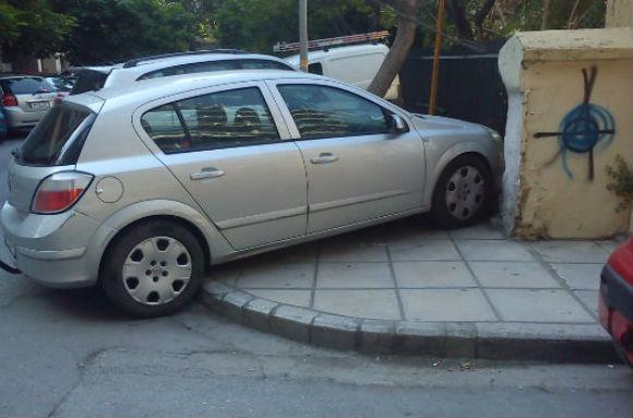 Ο απελπισμένος μάγκας που έπρεπε σώνει και καλά να παρκάρει κάτω από το σπίτι του (προφανώς) έχει παρκάρει στο πεζοδρόμιο που οδηγεί στο Ε’ Γυμνάσιο. Όσο απελπισμένος και νάσαι νομίζω πως πρέπει να σου περάσει από το μυαλό πως στη γειτονιά κυκλοφορούν και άνθρωποι εκτός από έντομα, που είναι τα μόνα που φαίνεται να χωράνε για να διασχίσουν το πεζοδρόμιο (ή και όχι;)