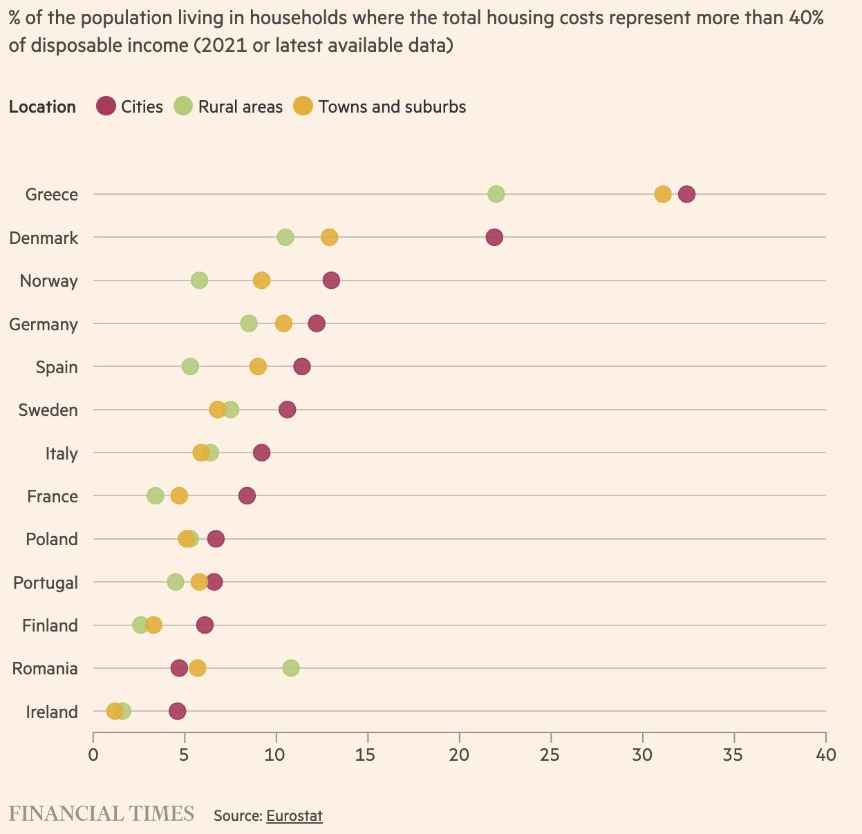 *Τα ενοίκια στην Ελλάδα μπορεί να ανεβαίνουν αλλά είναι πιο φτηνά από το εξωτερικό. Όχι; Ναι, αν δεν πάρει υπόψη σου το κόστος αυτό σε σύγκριση με το διαθέσιμο εισόδημα των πολιτών. Στον παρακάτω πίνακα βλέπουμε το ποσοστό του πληθυσμού που ζει σε νοικοκυριά που ξοδεύουν πάνω από το 40% του διαθέσιμου εισοδήματός τους στις ανάγκες στέγασης.