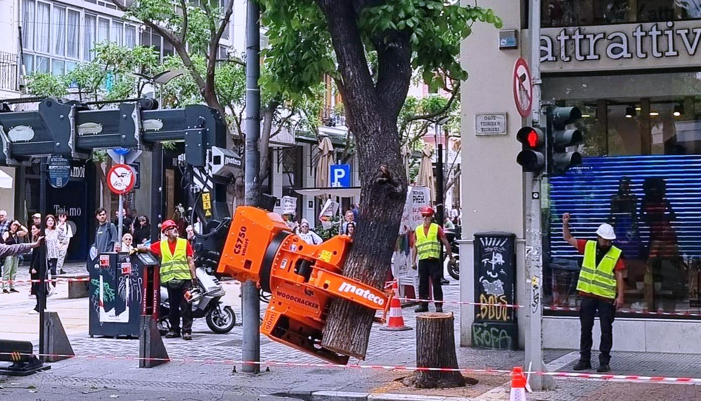 Τέτοιο εξοπλισμό κοπής μεγάλων δένδρων (μόνο για δάση και μεγάλα πάρκα….) σπάνια χρησιμοποιούν σε αστικό χώρο και μάλιστα σε εμπορικό κέντρο, πολύ επικίνδυνο…. Συνήθως κόβονται από αναρριχητές δενδροκόμους-ξυλοκόπους κομμάτι κομμάτι όταν έχει πέσει το φύλλωμα τον χειμώνα. Ίσως κάποιος διέθετε το μηχάνημα και πρέπει να αποσβεστεί… Περίεργα πράγματα. Και εάν ήταν άρρωστο γιατί δεν το διέγνωσαν νωρίτερα;