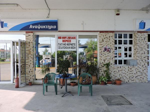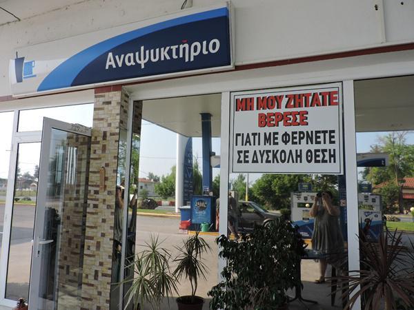 Ξεκινώντας να πας, δεν το καταλαβαίνεις. Τα πράγματα μέχρι και την έξοδο από Θεσσαλονίκη, δεν είναι τόσο άσχημα. Οι τιμές λίγο πεσμένες, η κίνηση έντονη. Αν χρειαστεί, όμως, να βάλεις βενζίνη σε ένα από τα βενζινάδικα του νομού Ημαθίας, από τη Χαλκηδόνα και μετά, βλέπεις ένα άλλο σκηνικό. Πρατήρια οι ιδιοκτήτες των οποίων έχουν αναγκαστεί να δηλώνουν τις προθέσεις τους με… ειδικές κατασκευές και ταμπέλες. Στο πρώτο, απλώς έβαλα βενζίνη και το πρόσεξα. Στο δεύτερο, σταμάτησα να βγάλω και φωτογραφίες. Δεν το είχα ξαναδεί, αυτό.