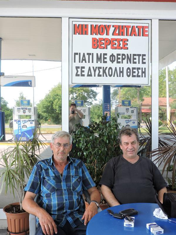 Στο δεύτερο βενζινάδικο, όμως, που είδα την ίδια κατάσταση, σταμάτησα. «Αυτό, κάτι σημαίνει», σκέφτηκα. Το συγκεκριμένο, λίγο πιο έξω από την Αλεξάνδρεια, πιο περιποιημένο και με μεγαλύτερη προσοχή, είχε δύο κανονικές ταμπέλες. Μία έξω από την είσοδο και μία επάνω σε μια από τις αντλίες. «Μη μου ζητάτε βερεσέ, γιατί με φέρνετε σε δύσκολη θέση», έγραφε η πρώτη. «Κάτω από πέντε ευρώ, δε βάζει η αντλία», η δεύτερη.