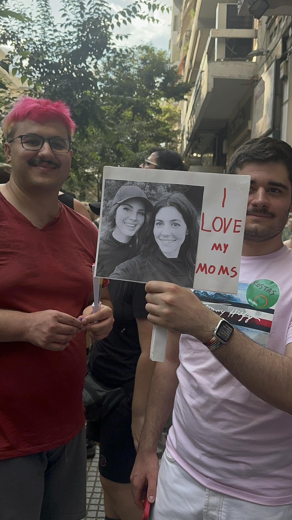 Η γιορτή μόλις ξεκίνησε, βαράμε την έναρξη με τις σφυρίχτρες και ξεκινάμε την παρέλαση που πραγματικά παρά την ζέστη δεν θέλαμε να τελειώσει. Μία κοπέλα έχει ζωγραφισμένο στην πλάτη της “love is love”, ένα αγόρι κρατά ένα πανό που γράφει “I love my moms”, μία μαμά με το παιδί της ανεβασμένο στους ώμους κρατά ένα χαρτόνι που γράφει “εγώ σ’αγκαλιάζω όπως είσαι”, ένα κορίτσι λέει σε ένα άλλο “φίλα με αγάπη μου, εδώ δεν έχεις να φοβάσαι τίποτα”, δύο αγόρια σηκώνουν τις γροθιές τους με δακρυσμένα τα μάτια και λαμπερά χαμόγελα στα χείλη χαιρετούσαν τις γιαγιάδες και τους παππούδες στα μπαλκόνια που χαμογελούσαν.