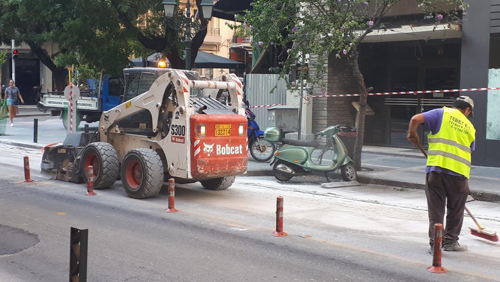 2. Εργασίες στην αριστερή πλευρά του δρόμου. Συνεργεία με τουλάχιστον 2 μηχανήματα ανοίγουν ένα κανάλι στο οδόστρωμα με τα γνωστά αποτελέσματα σε σκόνη και θόρυβο.