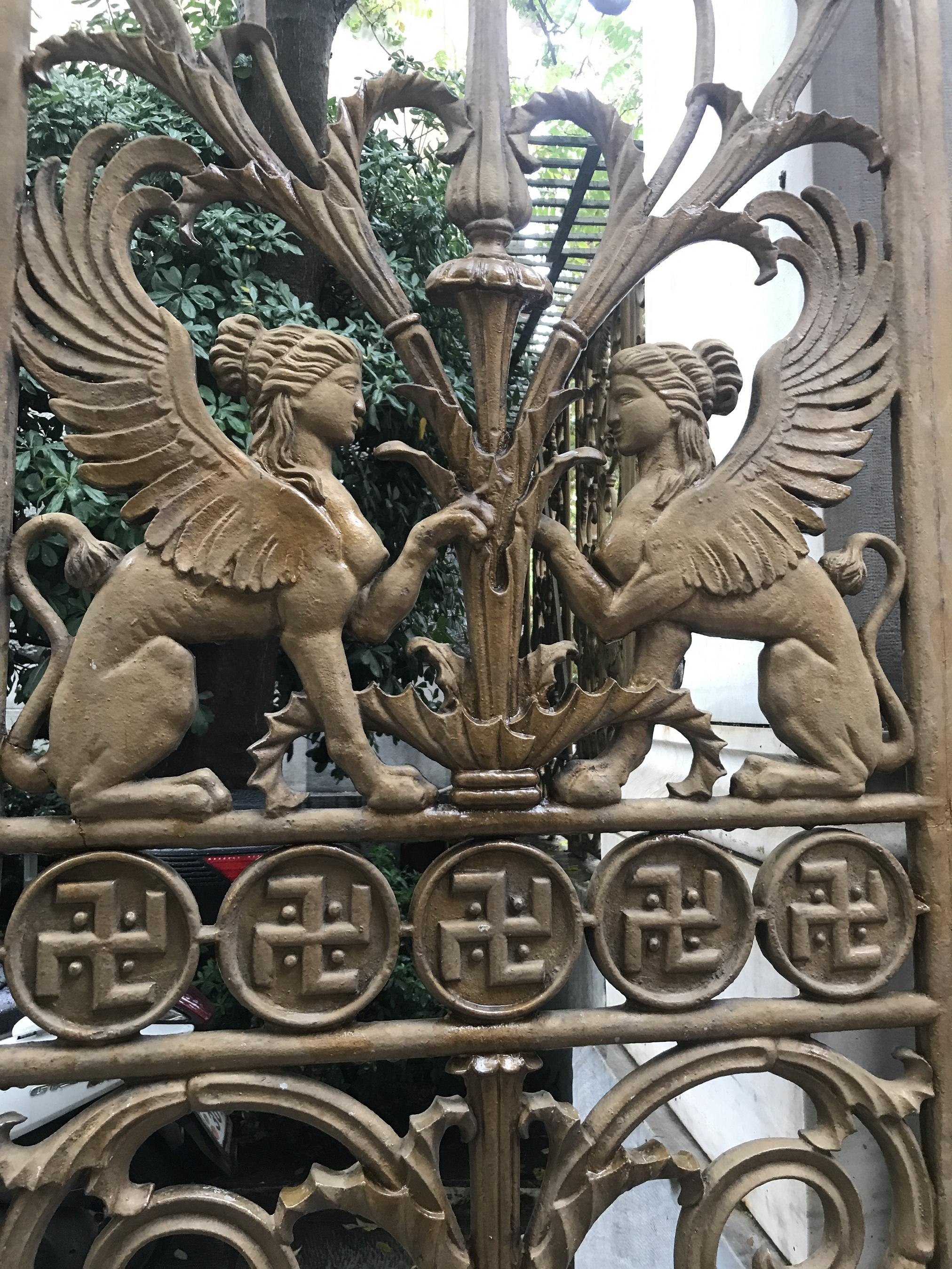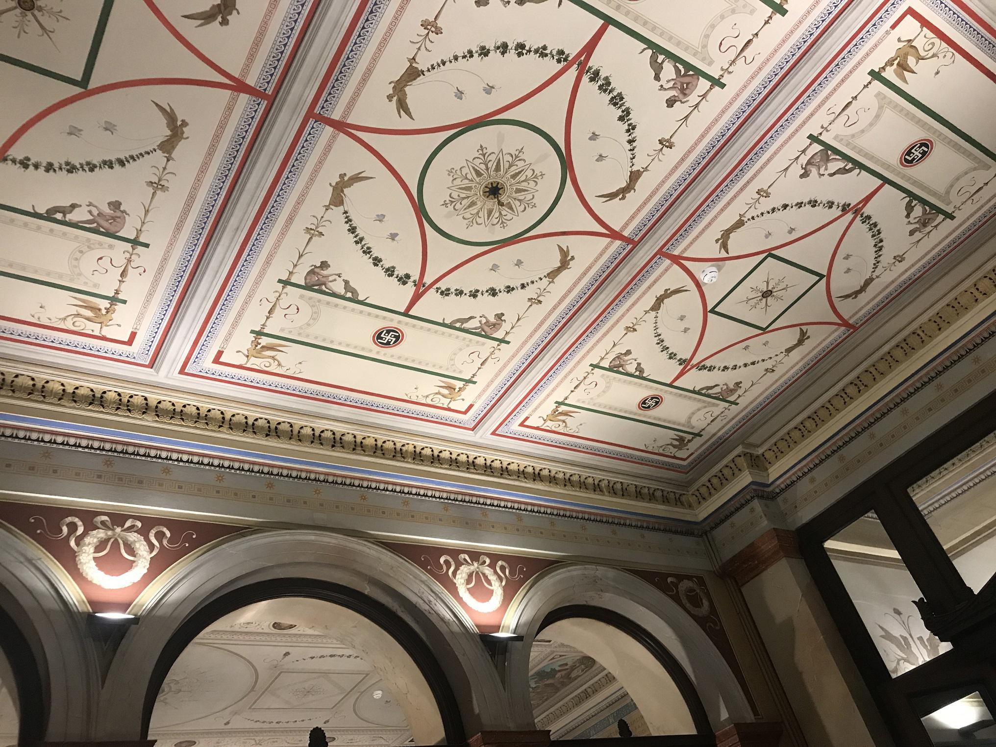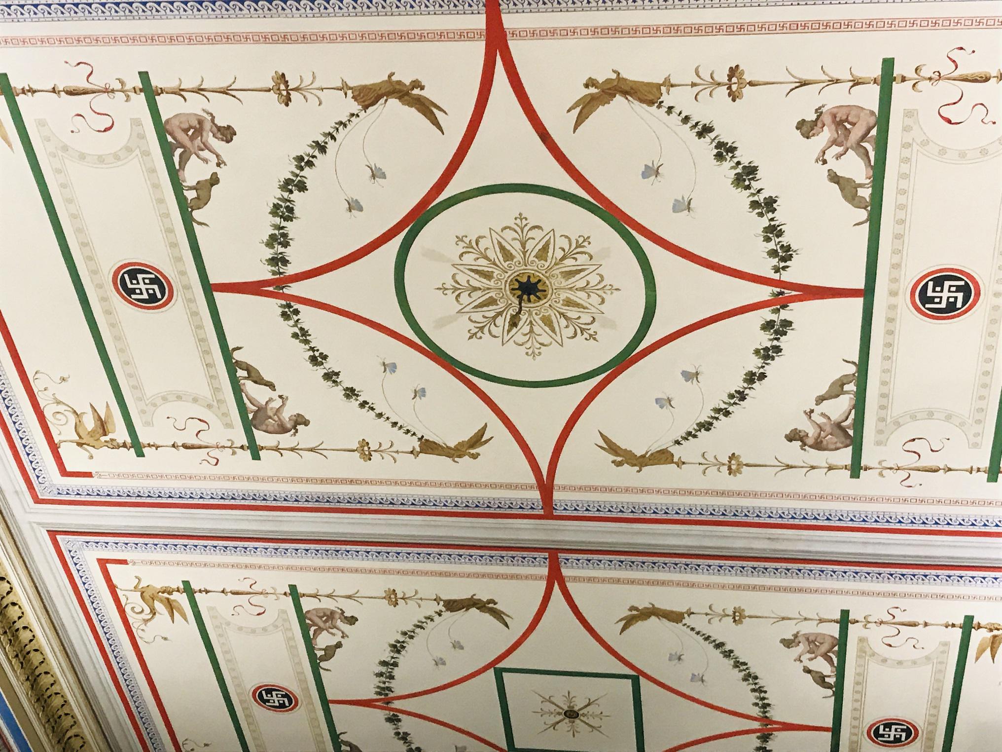 Συνήθως αυτό που κάνει με την πρώτη ματιά την μεγαλύτερη εντύπωση στους επισκέπτες του μουσείου είναι οι σβάστικες στα κάγκελα της εισόδου αλλά και στις ζωγραφικές αναπαραστάσεις στο ταβάνι του κεντρικού χώρου στο ισόγειο. Ο αγκυλωτός σταυρός κατά τη διάρκεια του 20ου αιώνα συνδέθηκε με το φασισμό, εξαιτίας της χρήσης του από τους Ναζί.