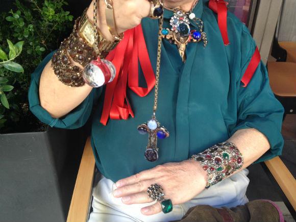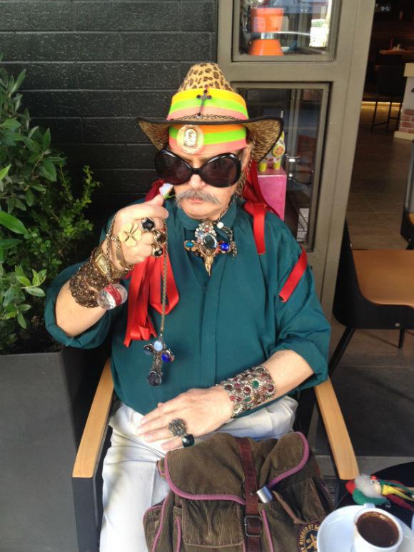 Οι περαστικοί του πρωινού στη Βασιλίσσης Όλγας τον βλέπουν κάθε πρωί στο ίδιο τραπέζι ενός γνωστού καφέ. Πίνει πάντα έναν ελληνικό καφέ. Φορά ένα εντυπωσιακό καουμπόικο καπέλο, έντονο πράσινο πουκάμισο, μεγάλα γυναικεία γυαλιά και πολλά σύμβολα. Βαριά κοσμήματα, ένα παιδικό παιχνίδι στο χέρι με έναν αρλεκίνο, σταυρούς, γυάλινες σφαίρες, μπιζού. Οι περαστικοί τον κοιτούν με ενδιαφέρον. Κάθεται πάντα μόνος και αμίλητος. Που και που κάνει μια μικρή τελετή με τη σφαίρα. Τον πλησιάσαμε. Μία από τις πιο εκκεντρικές φιγούρες της πόλης μιλά για πρώτη φορά.