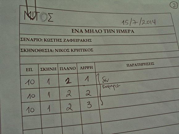 Πρώτη φορά που έγραψα κείμενα για άλλον ήταν για τη Δήμητρα Παπαδοπούλου, όταν συνεργαστήκαμε πριν από 4 χρόνια στο I Love Gr- μια ταξιδιωτική εκπομπή που ξεκίνησε με μπόλικο κέφι, χιλιάδες ιδέες και καλό άνεμο αλλά έσβησε άδοξα (ενώ θα μπορούσε να ήταν ένας άριστος τρόπος προβολής του τι πραγματικά είναι η Ελλάδα και πως την έχουμε στο μυαλό μας και την καρδιά μας, αλλά….). Το I Love Gr μου έδωσε πάντως την χαρά να γνωρίσω καλά και να δουλέψω με δυο απίθανα πλάσματα, την Φρόσω Ράλλη και τη Δήμητρα Παπαδοπούλου. Ήταν σκέτη παιδική χαρά το να γράφω κείμενα για τη Δήμητρα- κείμενα που ήταν κάτι ανάμεσα σε ταξιδιωτικό οδηγό και κωμωδία ή αν θέλεις μια λοξή, κεφάτη κι ανατρεπτική ματιά πάνω στις ομορφιές της Ελλάδας. Το «Ένα Μήλο Την Ημέρα» είναι μια πολύ καινούργια ιδέα στην τηλεόραση και είμαι όλο κέφια που έχω ανταμώσει με καινούργιους φίλους. Αντί να κάνουμε μια συμβατική εκπομπή διατροφής, προχωρήσαμε διαφορετικά, αναπτύξαμε το θέμα μ’ έναν αλλιώτικο τρόπο. Το «Μήλο» είναι ένα σήριαλ, σχόλιο στη διατροφική μας κουλτούρα, στην ενέργεια και τις παρενέργειες που έχει η σχέση μας με το φαγητό. Μέσα από κωμικές καταστάσεις και ουσιαστικές επιστημονικές πληροφορίες (σύμμαχος μου η Στέλλα Παναγιωτοπούλου που κάνει την έρευνα), σου μένουν στο τέλος του επεισοδίου, χαμόγελα και μια αφορμή να σκεφθείς δυο-τρία πράγματα για τη διατροφή σου, τη γυμναστική, την ευζωία.”