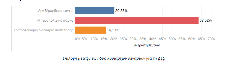 Στη συνέχεια ζητήθηκε από τους πολίτες να επιλέξουν ανάμεσα στα δύο σενάρια για τον χώρο της ΔΕΘ, η πλειοψηφία – σχεδόν δύο στους τρεις Θεσσαλονικείς – (63,5%) έδειξε ξεκάθαρη προτίμηση στο σενάριο του προτεινόμενου δημοψηφίσματος (Μητροπολιτικό Πάρκο). Μόνο το 16,1% στήριξε το εναλλακτικό σενάριο του προτεινόμενου σχεδίου ανάπλασης (Confex Park), ενώ το υπόλοιπο ποσοστό (20,4%) εμφανίστηκε αναποφάσιστο ή επιφυλακτικό.
