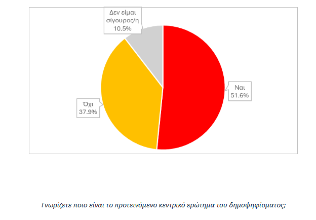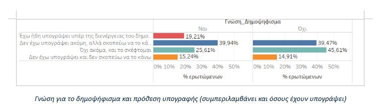 Η ενημέρωση ως μοχλός συμμετοχής: Η έρευνα δείχνει πως όσοι γνώριζαν ήδη για το δημοψήφισμα ήταν πολύ πιο πρόθυμοι να συμμετάσχουν (σχεδόν το 60% είχαν υπογράψει ή σκόπευαν να υπογράψουν). Αντίθετα, ανάμεσα στους ανενημέρωτους, κανείς δεν είχε υπογράψει, ενώ κυριαρχούσε η απάντηση που φανερώνει αβεβαιότητα. Η επαφή ωστόσο με την πληροφορία περί του δημοψηφίσματος ακόμη και κατά τη διάρκεια της έρευνας φαίνεται να ενεργοποίησε αρκετούς.