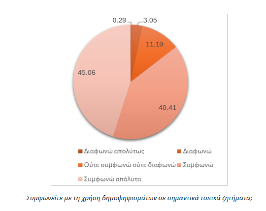 Παρά τα κενά στην πληροφόρηση, η υποστήριξη στον θεσμό του δημοψηφίσματος είναι συντριπτική καθώς το 76% των ερωτηθέντων συμφωνεί (ή συμφωνεί απόλυτα) με τη χρήση τοπικών δημοψηφισμάτων για κρίσιμα ζητήματα, ενώ το 90% δηλώνει πως η γνώμη των πολιτών οφείλει να έχει αποφασιστικό ρόλο στις αποφάσεις για την πόλη.