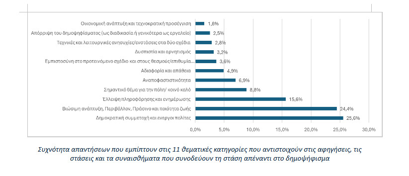 Πέρα από τους αριθμούς, μεγάλο ενδιαφέρον παρουσιάζουν οι αιτιολογήσεις που έδωσαν οι συμμετέχοντες σχετικά με τη στάση τους. Η ποιοτική ανάλυση των ανοικτών απαντήσεων ανέδειξε μια σειρά από αφηγήσεις, δηλαδή επαναλαμβανόμενα μοτίβα σκέψης, αξιών και συναισθημάτων, που εξηγούν γιατί οι πολίτες υποστηρίζουν ή απορρίπτουν το δημοψήφισμα. Συνολικά εντοπίστηκαν 11 διακριτές θεματικές κατηγορίες απαντήσεων οι οποίες απεικονίζονται στο παρακάτω Σχήμα. Όπως φαίνεται από την κατανομή των απαντήσεων στις κατηγορίες αυτές, η κυρίαρχη κατηγορία (25.6%) αφορά δημότες που βλέπουν το δημοψήφισμα ως μια πράξη θεσμικής κατοχύρωσης της φωνής των πολιτών. Η σύνδεση της συμμετοχής με την περιβαλλοντική προστασία (που επίσης εντοπίζεται σχεδόν στο ¼ των απαντήσεων) ενισχύει την ερμηνεία του ζητήματος ως κατεξοχήν πράσινου διακυβεύματος. Ιδιαίτερα σημαντική είναι και η κατηγορία που βλέπει τη διαδικασία ως μέσο υπεράσπισης του κοινού καλού (8,8%).