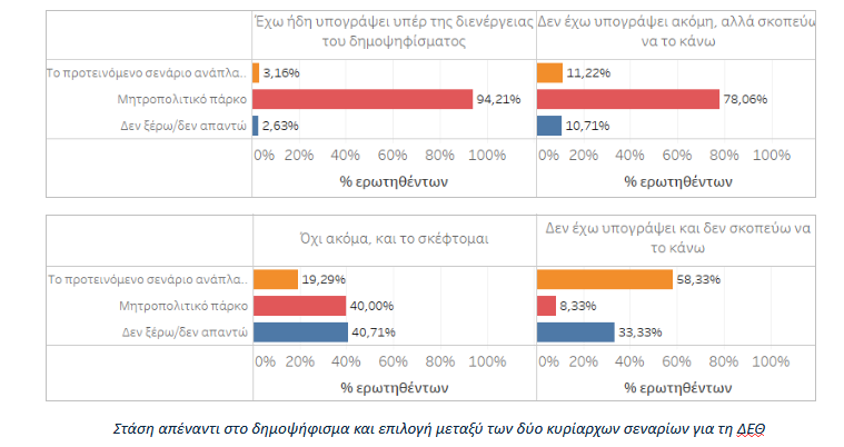 Η συσχέτιση της πρόθεσης υπογραφής με τη θέση των πολιτών απέναντι στα δύο προτεινόμενα σενάρια αξιοποίησης είναι – όπως αναμένονταν – ιδιαίτερα έντονη. Όσο πιο υποστηρικτικός/η είναι κάποιος/α στο δημοψήφισμα τόσο πιο πιθανό είναι να στηρίζει το σενάριο του Μητροπολιτικού Πάρκου. Συγκεκριμένα, μεταξύ όσων έχουν ήδη υπογράψει, ένα συντριπτικό 94,2% υποστηρίζει τη δημιουργία Μητροπολιτικού Πάρκου. Αντίθετα, στους πολίτες που δηλώνουν ότι δεν σκοπεύουν να υπογράψουν, μόλις το 8,3% τάσσεται υπέρ του Μητροπολιτικού Πάρκου. Επίσης, μεταξύ αυτών που δήλωσαν αναποφάσιστοι για το αν θα υπογράψουν για το δημοψήφισμα παρατηρούμε μια σαφή τάση προτίμησης του Μητροπολιτικού Πάρκου σε σχέση με το Confex Park.