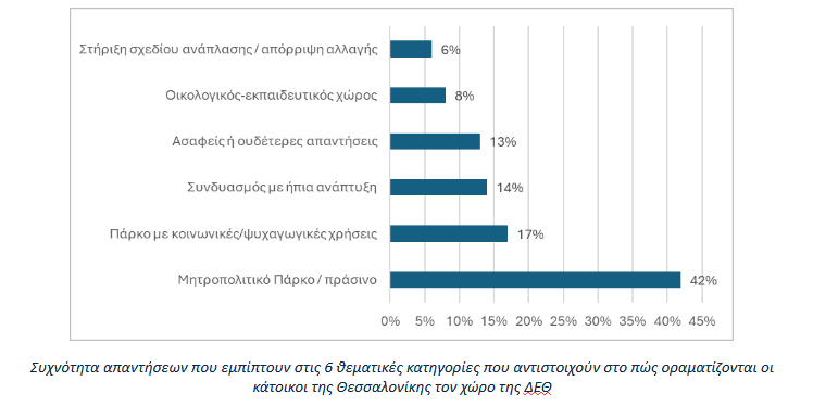 1. Ο χώρος ως πνεύμονας πρασίνου (42% των απαντήσεων): Η κυρίαρχη αφήγηση βλέπει τον χώρο της ΔΕΘ ως μεγάλο πράσινο δημόσιο πάρκο, ανοιχτό σε όλους. Η έμφαση δίνεται στο περιβαλλοντικό όφελος, την ελεύθερη πρόσβαση και τη βελτίωση της ποιότητας ζωής στο κέντρο της πόλης.