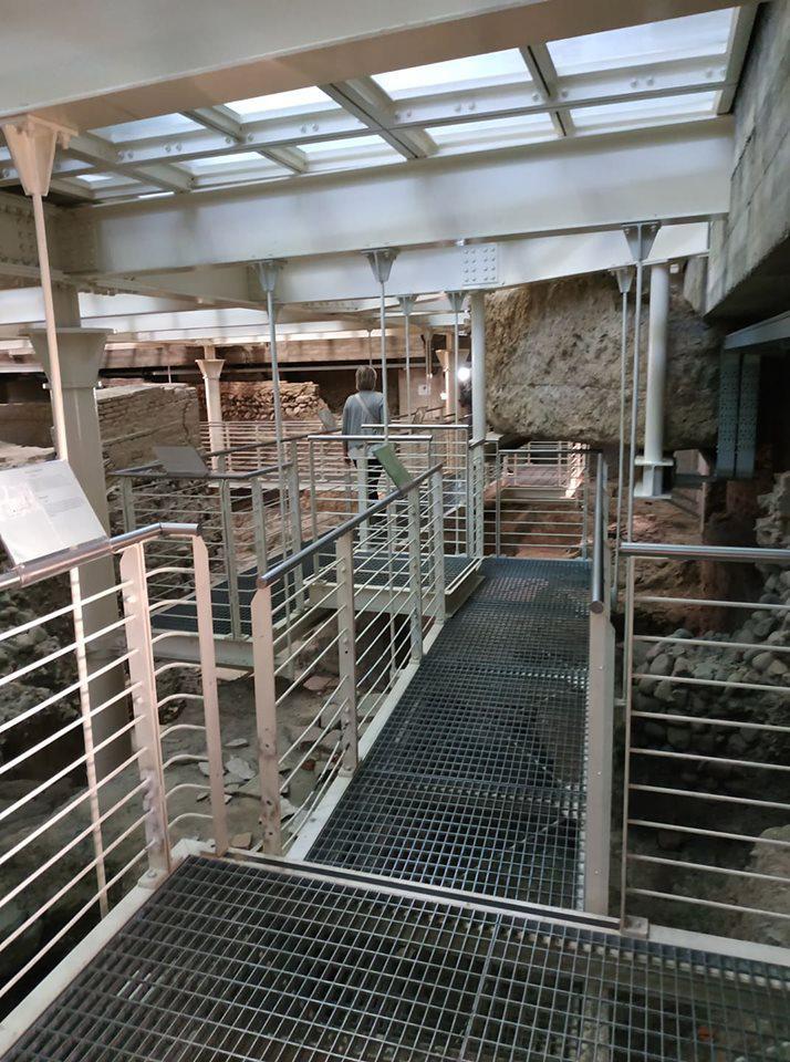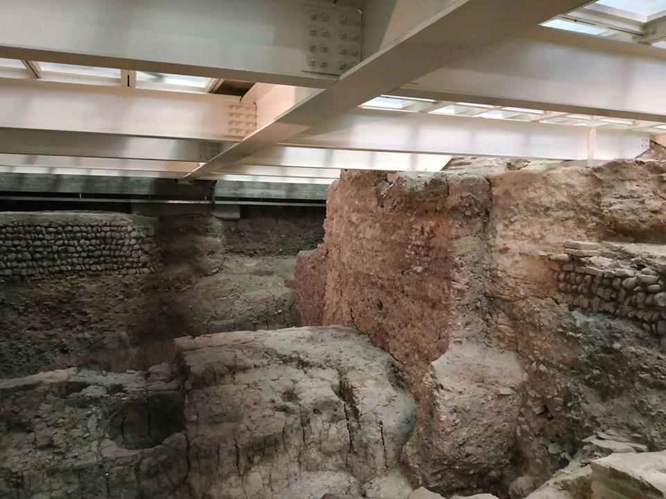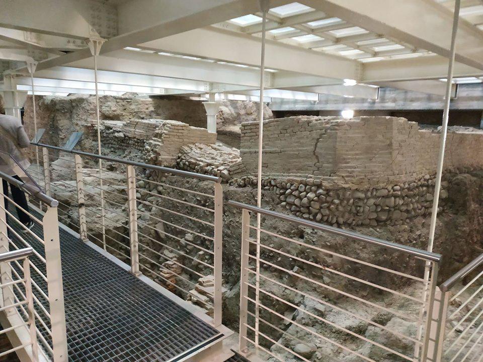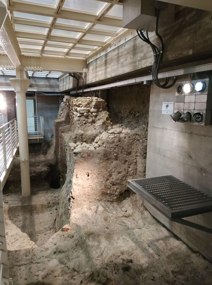 Αποσπασματικά λείψανα της διαχρονίας της πόλης – κι όχι ένα ολοκληρωμένο μνημειακό σύνολο – αντιμετωπίστηκαν με σεβασμό, συντηρήθηκαν και αναδείχθηκαν με θαυμαστό τρόπο, χωρίς ωστόσο τα ίδια τα ερείπια να είναι εντυπωσιακά. Ορατά από το γυάλινο δάπεδο του αιθρίου του κτηρίου είναι ταυτόχρονα επισκέψιμα κάτω από αυτό μέσω μεταλλικών διαδρόμων.