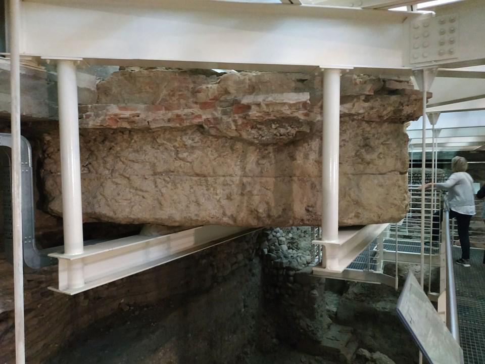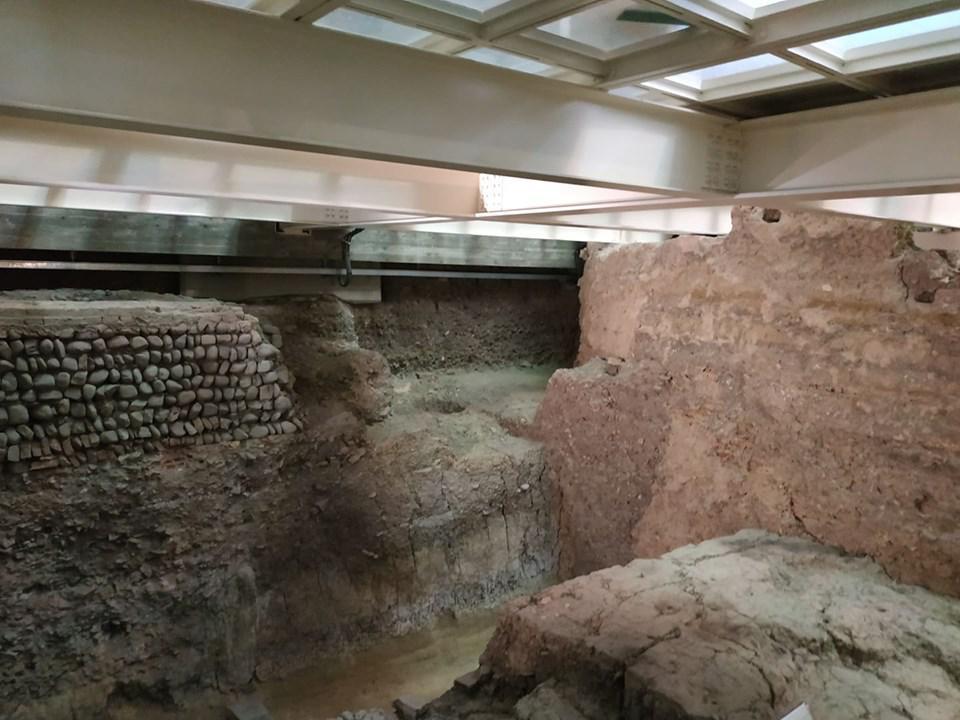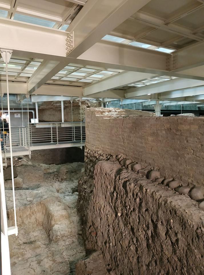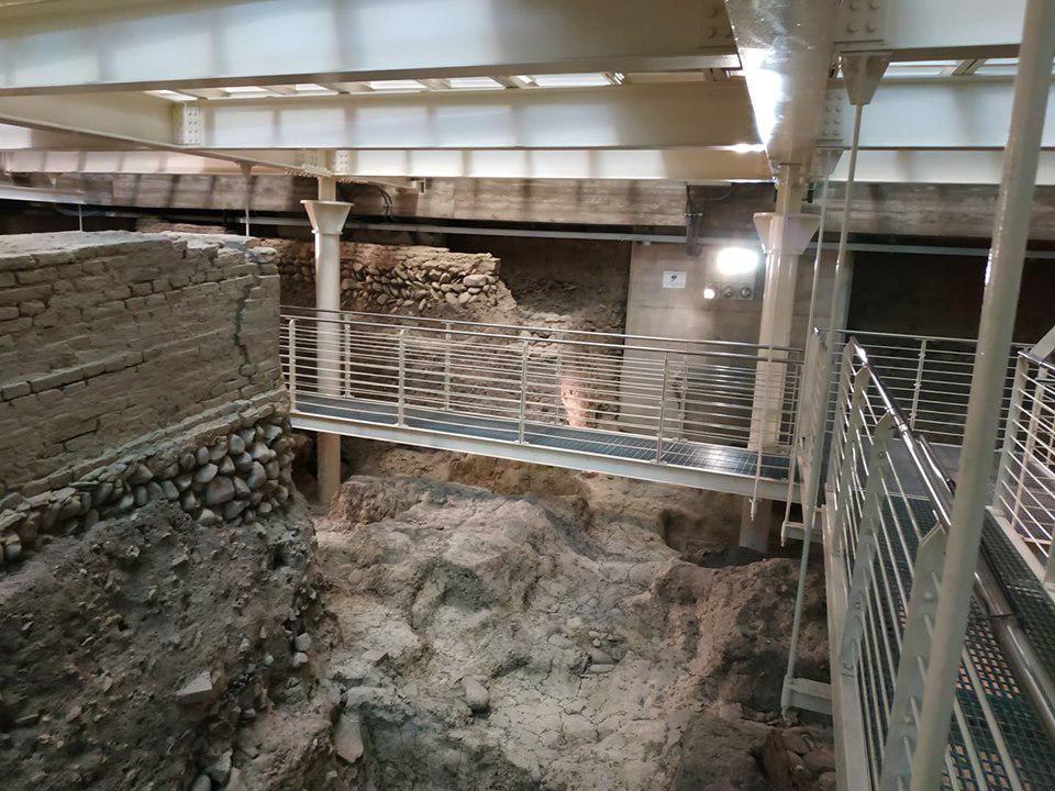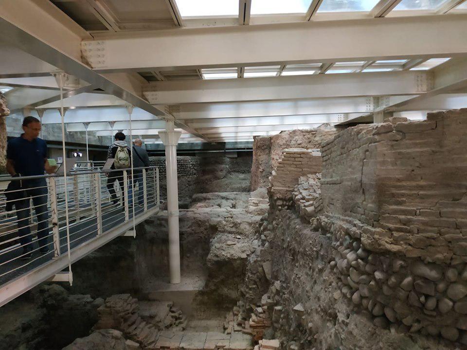 Αποσπασματικά λείψανα της διαχρονίας της πόλης – κι όχι ένα ολοκληρωμένο μνημειακό σύνολο – αντιμετωπίστηκαν με σεβασμό, συντηρήθηκαν και αναδείχθηκαν με θαυμαστό τρόπο, χωρίς ωστόσο τα ίδια τα ερείπια να είναι εντυπωσιακά. Ορατά από το γυάλινο δάπεδο του αιθρίου του κτηρίου είναι ταυτόχρονα επισκέψιμα κάτω από αυτό μέσω μεταλλικών διαδρόμων.