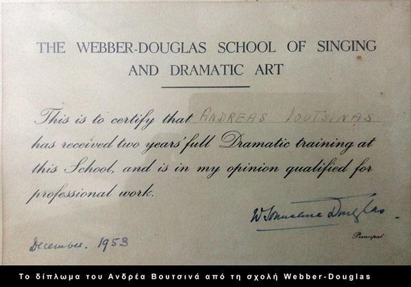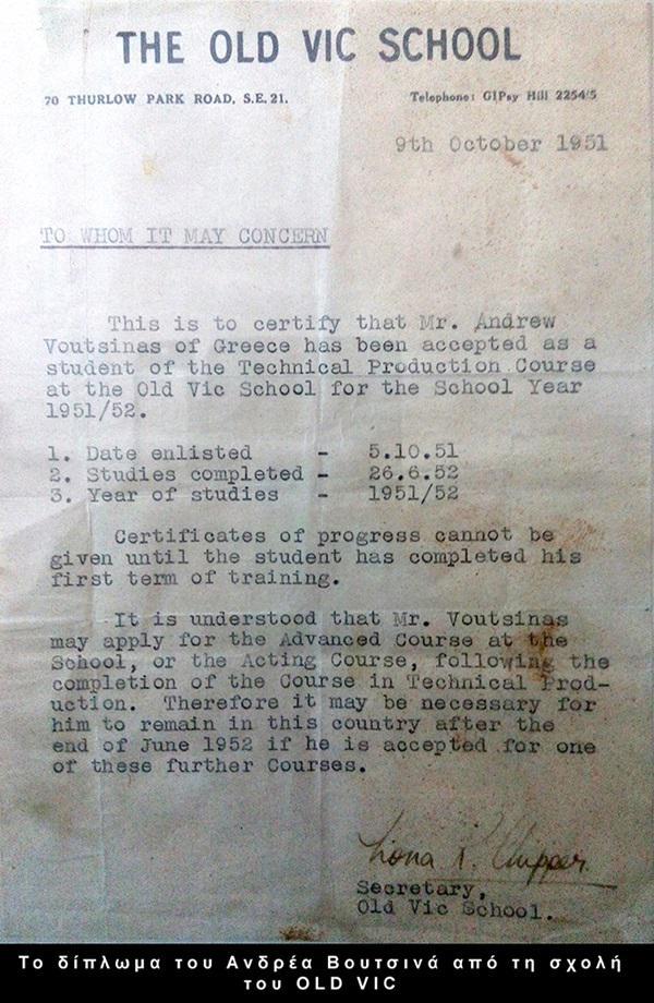 Κι εμάς μας άρεσε ο καταπληκτικός Ανδρέας και το νερό μπήκε στο αυλάκι σιγά-σιγά και όλα ήρθαν με τη σειρά τους και τον αγώνα μας όπως τα θέλαμε. Και να λοιπόν η δραματική σχολή μας με τον Ανδρέα διευθυντή σπουδών. Όλα αυτά ακούγονται γλυκά κι όμορφα αλλά τα θαύματα του ελληνικού κράτους καλά κρατούσαν και τότε και πάντα. Δε θα ξεχάσω τη μέρα που συνόδευσα τον Ανδρέα στο αεροδρόμιο για να ταξιδέψει ένα τριήμερο στη Γαλλία. Ο λόγος; Το υπουργείο πολιτισμού ζήτησε τα διπλώματα του για να τον εγκρίνει ως διευθυντή σπουδών… τα διπλώματα του Βουτσινά!!! Ο οποίος θυμόταν ότι τα είχε στο σπίτι του στη Γαλλία αλλά πού τα είχε… και μετά μάθαμε πως τα είχε κρεμάσει στην τουαλέτα απέναντι από τη λεκάνη της τουαλέτας για να τα βλέπει, λέει, όταν κάθεται!!! Και εκεί λοιπόν στο αεροδρόμιο που περιμέναμε να φύγει μου λέει πως ο Ζακ Λανγκ του είχε δώσει τιμητικό δίπλωμα για την προσφορά του και η Ελλάδα τον στέλνει Γαλλία στα εβδομήντα τόσο για να φέρει αποδείξεις… Όταν έφερε τα διπλώματα είδαμε πως στο πίσω μέρος ήταν γραμμένο το βιογραφικό του. Η μάνα μου το έγραψε, μας είπε στα αγγλικά…