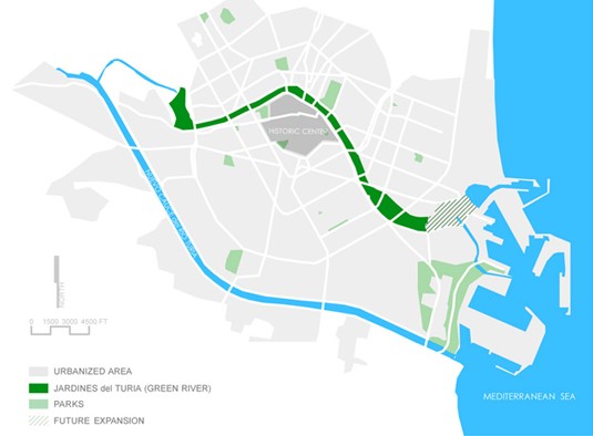 Η Βαλένθια είναι μια πόλη χτισμένη στις εκβολές ενός ποταμού, του Γκουαδαλαβιάρ. Στην αρχαιότητα λέγονταν Τούρις από όπου και το έτερο σημερινό του όνομα Τούρια. Η παλιά κοίτη του ποταμού που διερχόταν μέσα από την Βαλένθια έχει μετατραπεί σήμερα σ΄ ένα πάρκο μήκους 9 χλμ. και έχει εκτροπή της κοίτης σε νέο τεχνητό κανάλι.