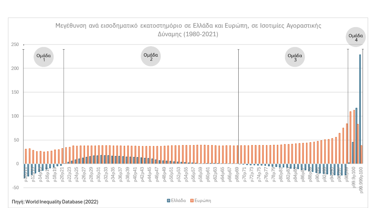 Γιατί, όμως, η συζήτηση αυτή δεν έχει γίνει στην Ελλάδα; Αν αφήσουμε στην άκρη (για την ώρα) την απροθυμία των ελληνικών κυβερνήσεων των τελευταίων ετών (ή δεκαετιών) να ασχοληθούν σοβαρά με το θέμα, η -τεχνική- απάντηση είναι απλή και έχει να κάνει με την έλλειψη κατάλληλων στοιχείων. Αυτό όμως έχει αρχίσει να αλλάζει το τελευταίο διάστημα. Μία από τις πηγές πληροφόρησης που έγινε πρόσφατα διαθέσιμη είναι το portal της World Inequality Database. Εκεί ο ενδιαφερόμενος αναγνώστης μπορεί να βρει ένα πλήθος στατιστικών, πολλές από τις οποίες δίνουν χρήσιμες πληροφορίες συχνά σε βάθος δεκαετιών. Μία από αυτές (εμπνευσμένη από τη δουλειά των Lakner και Milanovic) είναι αυτή που περιγράφει την μεταβολή του εισοδήματος κάθε εκατοστημορίου της συνολικής κατανομής κάθε χώρας μεταξύ 1982 και 2024.