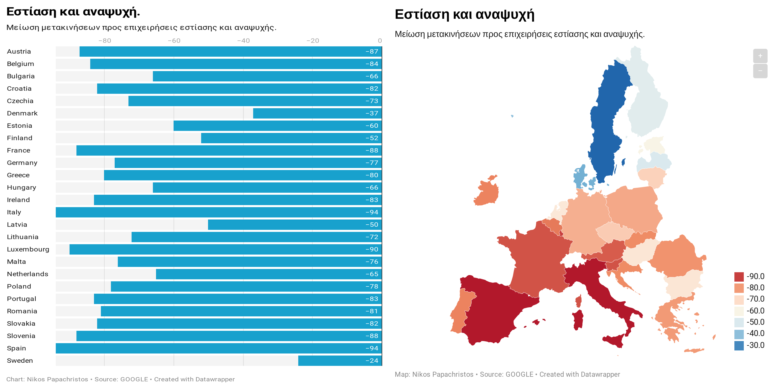 Συμπερασματικά, βλέπουμε χώρες, οι οποίες πλήττονται περισσότερο από το νέο Κορωνοϊό όπως η Ιταλία και η Ισπανία να παρουσιάζουν μεγαλύτερη μεταβολή στη μετακίνηση των πολιτών, όπως και οι χώρες που υιοθέτησαν έγκαιρα μέτρα περιορισμού, όπως η Ελλάδα. Αντίθετα, χώρες που διαφοροποιούνται από τη στρατηγική του lockdown, παρουσιάζουν πολύ μικρότερη μείωση των συνολικών μετακινήσεων ενώ πολλές φορές σημειώνουν σημαντική αύξηση (πχ Σουηδία). Αναμένουμε την επόμενη έκθεση δεδομένων, που μπορεί να οδηγήσει σε περαιτέρω αναλυτικά και συγκριτικά συμπεράσματα.