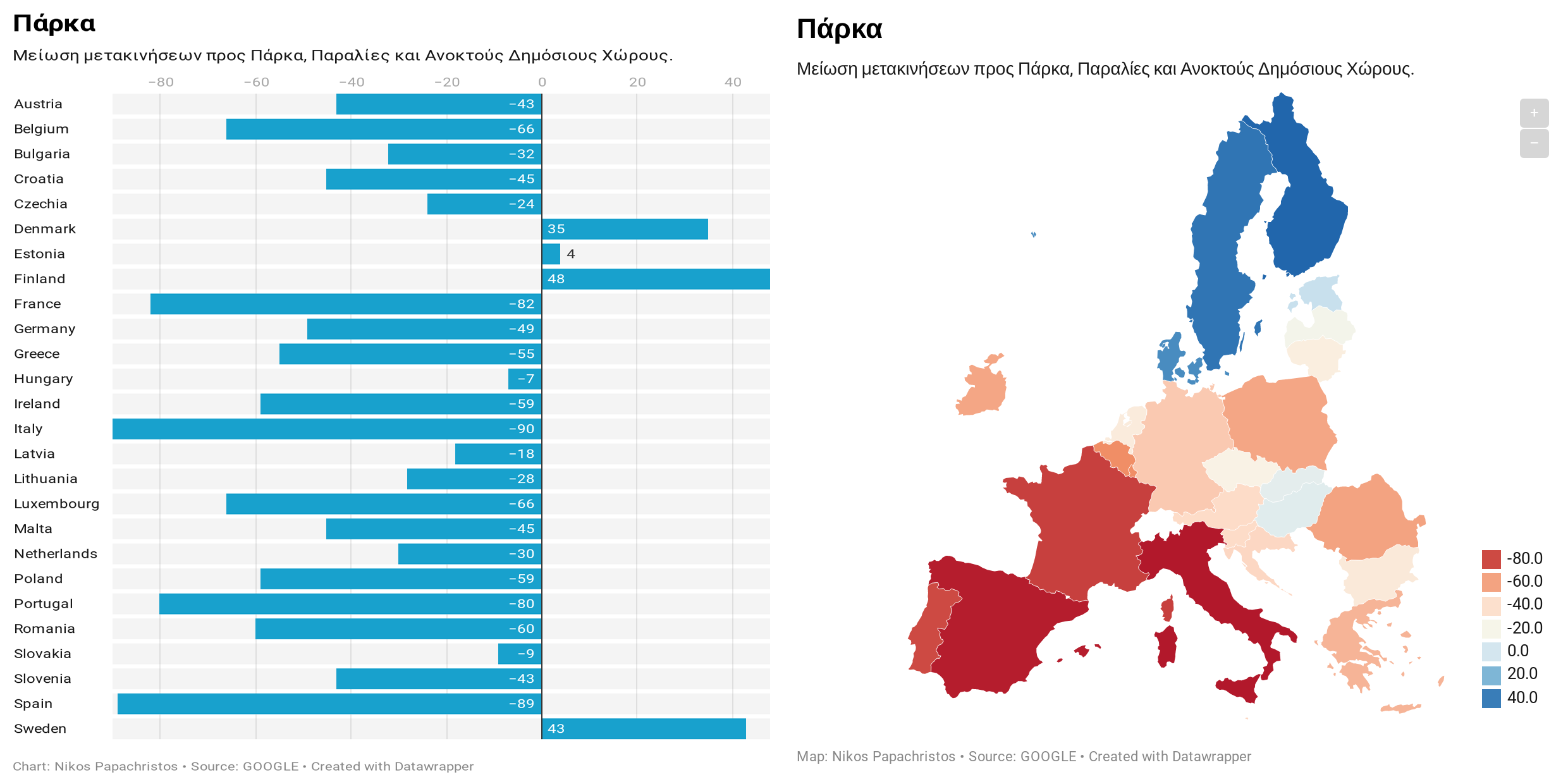 Στην κατηγορία αυτή παρουσιάζεται η τάση μετακίνησης προς Πάρκα και Δημόσιους Χώρους. Η διάμεση τιμή είναι -44%. Οι χώρες με τη μεγαλύτερη διαφοροποίηση είναι αυτές που παρουσιάζουν αύξηση μετακίνησης προς τέτοιου τοποθεσίες όπως, η Σουηδία (+43%) και η Φινλανδία (+48%), ενώ οι χώρες με τη σημαντικότερη μείωση, είναι η Ιταλία (-90%) και η Ισπανία (-89%). Η Ελλάδα κυμαίνεται στο -55%.