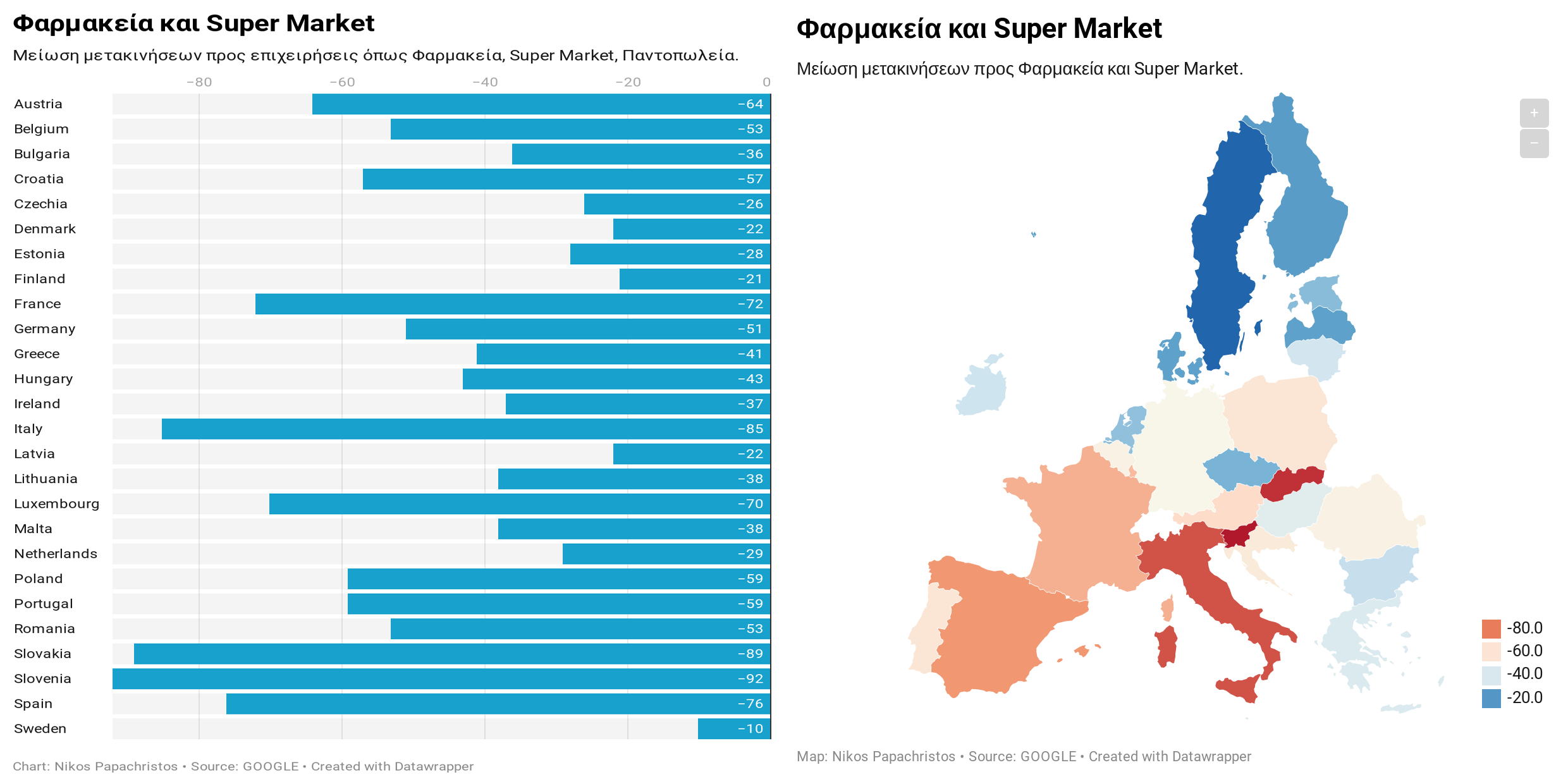 Στην κατηγορία αυτή παρουσιάζεται η τάση μετακίνησης προς Σούπερ Μάρκετ και Φαρμακεία. Η διάμεση τιμή είναι -47%. Οι χώρες με τη μικρότερη μείωση είναι η Σουηδία (-10%) και η Φινλανδία (-21%), ενώ οι χώρες με τη μεγαλύτερη, είναι η Σλοβενία (-92%) και η Σλοβακία (89%). Η Ελλάδα κυμαίνεται στο -41%.