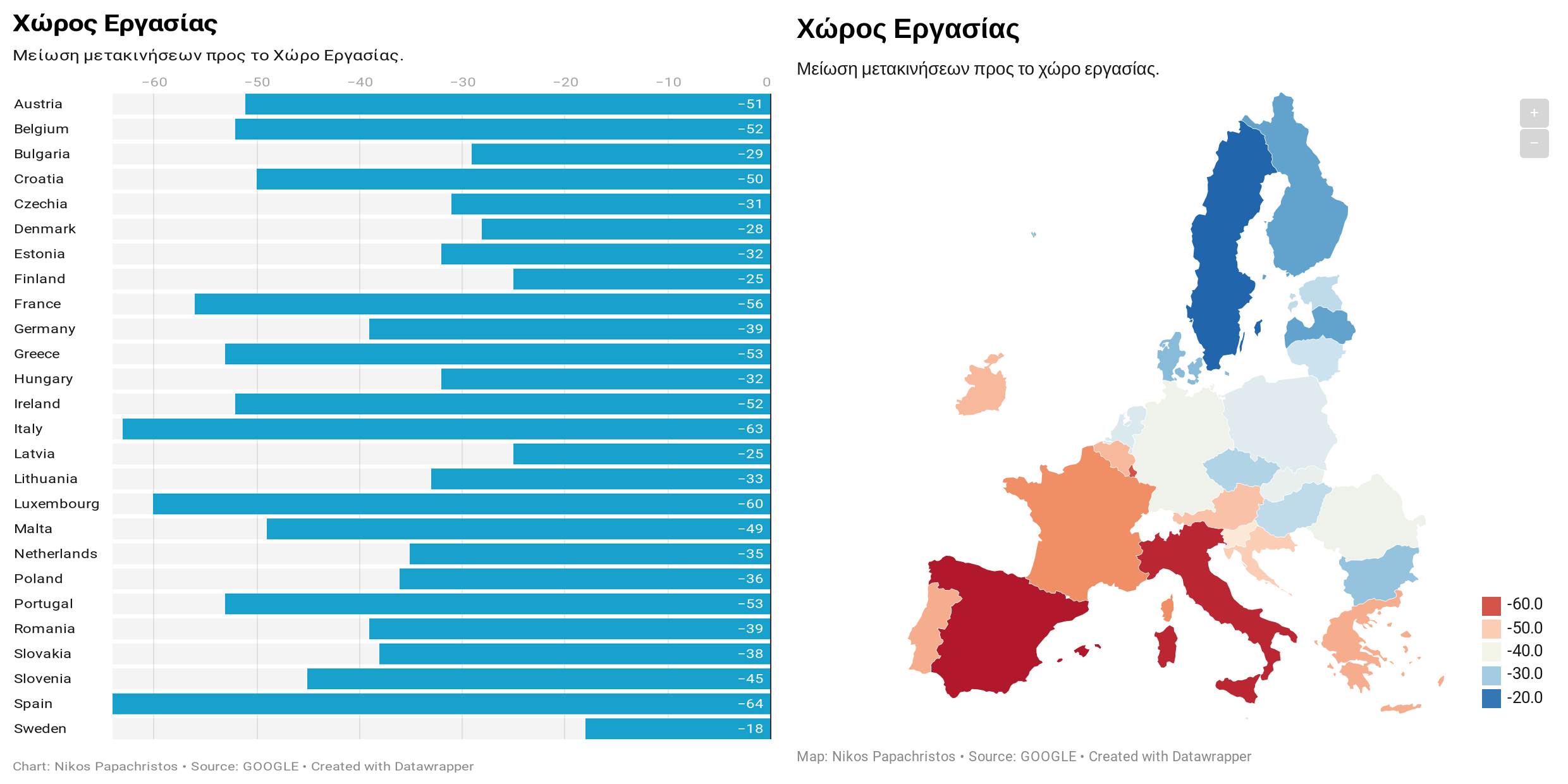 Στην κατηγορία αυτή παρουσιάζεται η τάση μετακίνησης προς τον τόπο Εργασίας. Η διάμεση τιμή είναι -39%. Οι χώρες με τη μικρότερη μείωση είναι η Σουηδία (-18%), η Λετονία με (-25%) και η Φινλανδία (-25%), ενώ οι χώρες με τη μεγαλύτερη, είναι η Ιταλία (-63%) και η Ισπανία (-64%). Η Ελλάδα κυμαίνεται στο -53%.