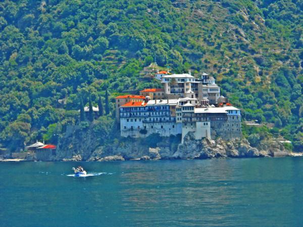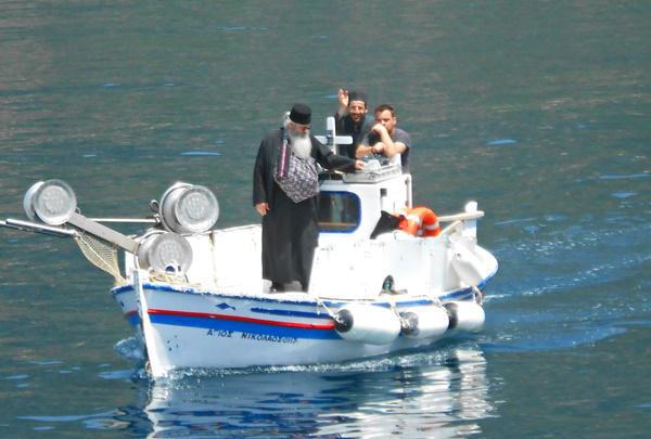 Όλα καλά ως εδώ μέχρι που πριν μερικές μέρες σε ένα τριήμερο στην προ του Άθω περιοχή, επιβιβάστηκα από την Ουρανούπολη σε ένα σκάφος που κάνει τον περίπλου του Αγίου Όρους. Κατι που χρόνια ήθελα να κάνω αλλά δεν τα είχα καταφέρει. Μια πανέμορφη διαδρομή που είναι και ο μόνος τρόπος να δει μια γυναίκα από σχετικά κοντινή απόσταση τα αρχιτεκτονικά αριστουργήματα των σκητών και των Μονών. Στα μέσα περίπου της διαδρομής και μπροστά από τη Μονή Γρηγορίου το πλοιαράκι μας σταμάτησε και μια βάρκα μας πλησίασε.