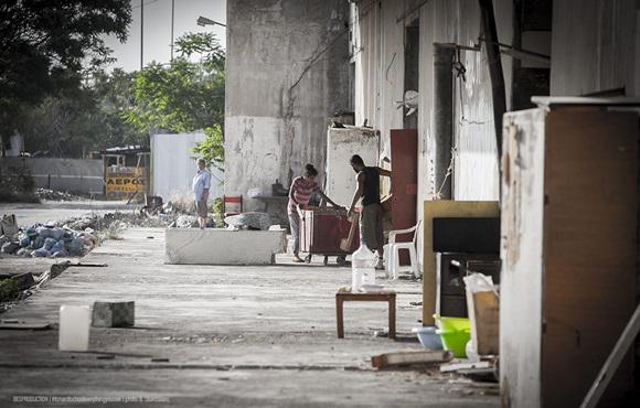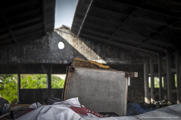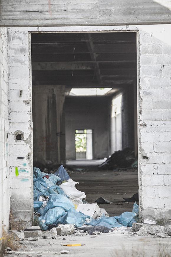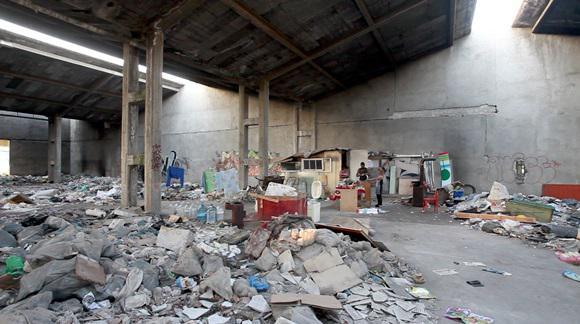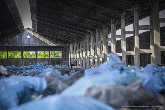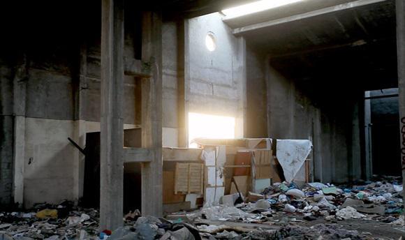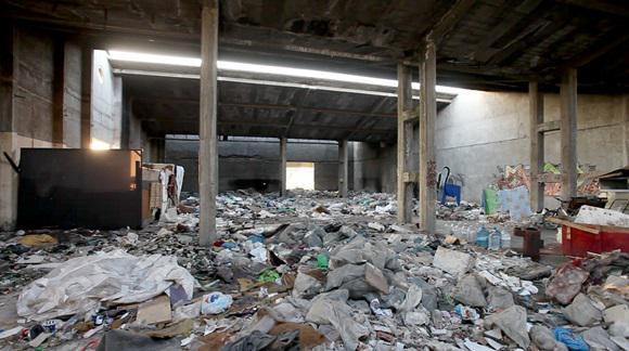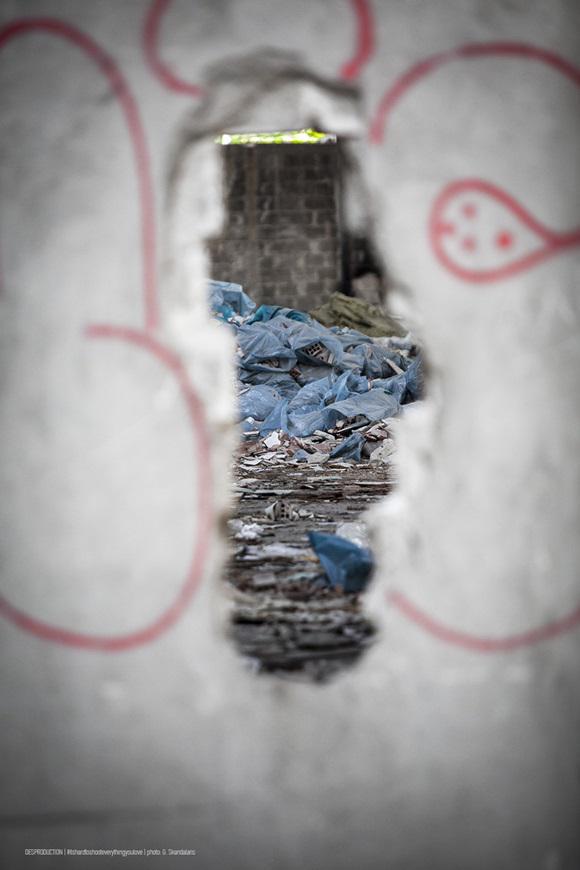 Το μέταλλο που υπήρχε στην οροφή των αποθηκών ξηλώθηκε για να πουληθεί στις γύρω μάντρες, όπως γίνεται και με τις πραμάτειες τους, να φορτωθεί και να φύγει για μεταπώληση. Από τα ανοίγματα της οροφής το φως του ανοιξιάτικου ήλιου «εισβάλλει» στους αχανείς χώρους και αποκαλύπτει μια θάλασσα από μπάζα που έχουν καλύψει κάθε σπιθαμή από το πάτωμα των αποθηκών. Οικοδομικά υλικά, σπασμένοι νιπτήρες, γυάλινα μπουκάλια από ξενυχτάδικα, τούβλα και απομεινάρια κάποιας ανακαίνισης κάνουν το χώρο να μοιάζει με βομβαρδισμένο τοπίο.
