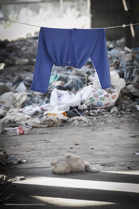 «Κάθε μέρα τα μικρά κάνουν μπάνιο, προσέχουμε πολύ», μου λέει ο πατέρας τους, ένας χαμογελαστός 40αρης και μας ανοίγει την μια φούξια κουρτίνα για να δούμε το «σπίτι» του. Χαλιά και κομμάτια μοκέτας στο πάτωμα, ένας πρόχειρος πάγκος και ένα τραπεζάκι, χωριστά δωμάτια για τα παιδιά, αφίσες με καρτούν στους τοίχους από κόντρα πλακέ και λιγοστά παιχνίδια. Λίγο πιο πέρα έχουν στήσει μια υποτυπώδη τουαλέτα στην προσπάθεια τους να δημιουργήσουν όσο το δυνατόν πιο ανθρώπινες συνθήκες διαβίωσης σε ένα αφιλόξενο περιβάλλον. «Δεν υπάρχουν δουλειές στη Βουλγαρία», λένε και γι’ αυτό έρχονται στην Ελλάδα να μαζέψουν το μέταλλο.