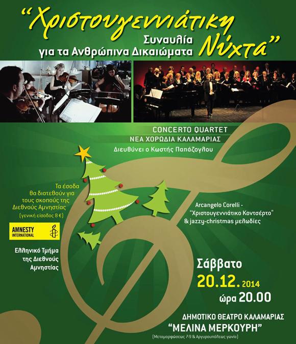 Το Ελληνικό Τμήμα της Διεθνούς Αμνηστίας σε συνεργασία με τον Δήμο Καλαμαριάς διοργανώνουν για 9η χρονιά την «Χριστουγεννιάτικη Νύχτα», μια συναυλία αφιερωμένη στα Ανθρώπινα Δικαιώματα, τα έσοδα της οποίας θα διατεθούν για το έργο και τη δράση του Ελληνικού Τμήματος της Διεθνούς Αμνηστίας. Η Νέα Χορωδία του Δήμου Καλαμαριάς υπό τη διεύθυνση του Κωστή Παπάζογλου συμπράττει με το γνωστό στην πόλη μας Concerto Quartet σε μια Χριστουγεννιάτικη Νύχτα, για να θυμηθούμε όλοι μας τα ανθρώπινα δικαιώματα που ακόμη και σήμερα καταπατούνται. Το «Χριστουγεννιάτικο Κοντσέρτο» του A. Corelli, αποσπάσματα από τα πιο γνωστά χορωδιακά χριστουγεννιάτικα έργα (Μεσσίας του Haendel, Gloria του A. Vivaldi) και πολλές jazzy-christmas μελωδίες συνθέτουν ένα ατμοσφαιρικό καλλιτεχνικό πρόγραμμα που θα το απολαύσουν μικροί και μεγάλοι. Η προπώληση εισιτηρίων θα γίνεται στο Δημοτικό Θέατρο Καλαμαριάς ‘Μελίνα Μερκούρη’.