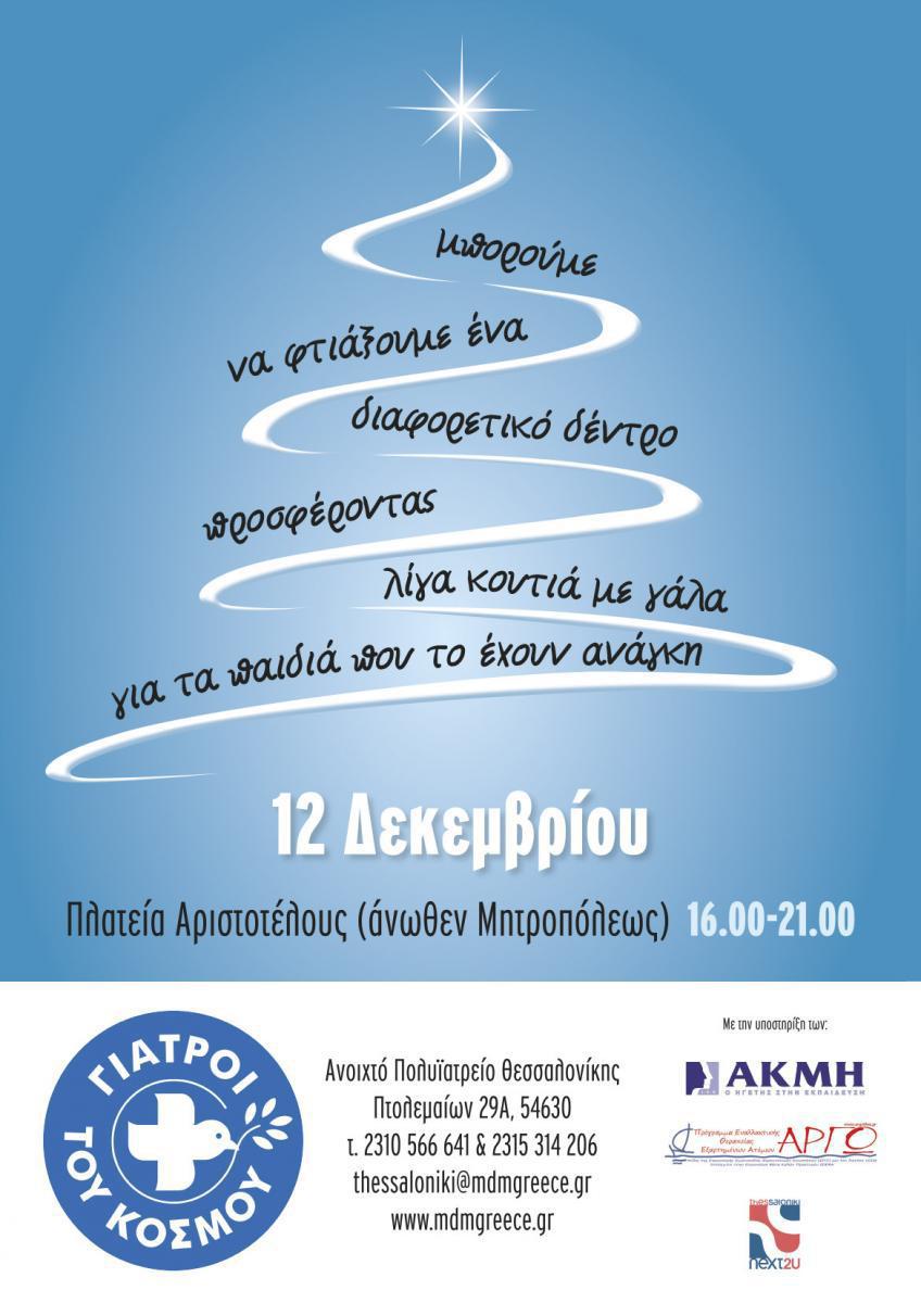 H Ελληνική Αντιπροσωπεία των Γιατρών του Κόσμου σας καλεί και φέτος να στήσετε μαζί ένα δέντρο από γάλα, για να έχουν και αυτά τα Χριστούγεννα όλα τα παιδιά ένα ποτήρι ζεστό γάλα. Μια μικρή αλλά σημαντική χειρονομία αγάπης και αλληλεγγύης σε μια περίοδο που η χώρα μας βιώνει ανθρωπιστική κρίση και όλοι έχουμε ανάγκη να κάνουμε κάτι συμπράττοντας για όσους το χρειάζονται. Στην περσινή γιορτή η συμμετοχή του κόσμου συγκεντρώθηκαν πάνω από 55.000 κουτιά γάλα και 4 τόνοι τρόφιμα σε όλη την Ελλάδα. Φέτος, σας περιμένουν πάλι στις 12 Δεκεμβρίου στην Πλατεία Αριστοτέλους (άνωθεν Μητροπόλεως) από τις 16:00-21:00. Στην εκδήλωση θα συμμετέχει η ομάδα κρουστών του Προγράμματος Εναλλακτικής Θεραπείας Εξαρτημένων Ατόμων «ΑΡΓΩ», η Εθελοντική Ομάδα ThessalonikiNext2U και τα ΙΕΚ ΑΚΜΗ. Γιορτάστε ενισχύοντας παράλληλα με όσα περισσότερα γάλατα εβαπορέ μπορείτε.