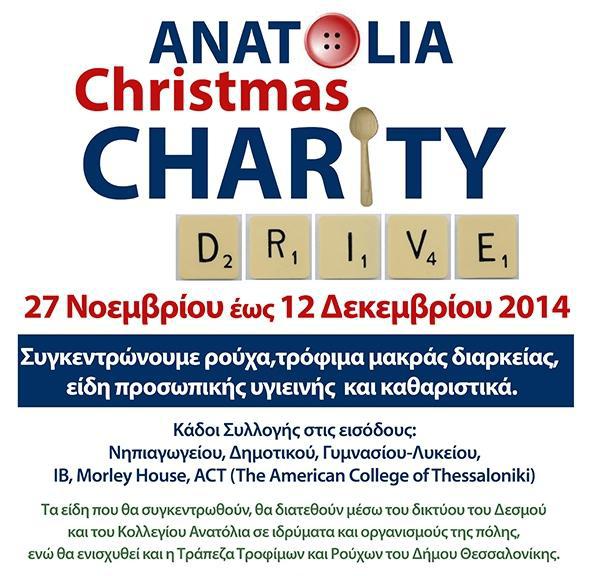 * Charity Drive: 27/11-12/12, Κολλέγιο Ανατόλια Χριστουγεννιάτικο Bazaar: 14/12, Ώρες: 17.00-20.00