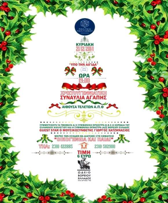 Η καθιερωμένη «Χριστουγεννιάτικη Συναυλία Αγάπης» θα πραγματοποιηθεί την Κυριακή 21 Δεκεμβρίου 2014 και ώρα 19.00, στην Αίθουσα Τελετών του Α.Π.Θ., με συμμετοχή της ορχήστρας «Mozart», της ορχήστρας «Αστεράκια», της «Συμφωνικής Ορχήστρας Ωδείου Βορείου Ελλάδος», της «Συμφωνικής Ορχήστρας Jazz Βορείου Ελλάδος» και με guest star στο πιάνο, τον καταξιωμένο έλληνα μουσικοσυνθέτη κ. Γιώργο Χατζηνάσιο. Μέρος των εσόδων της συναυλίας, θα αποδοθεί για την κάλυψη αναγκών του συλλόγου για άπορες οικογένειες, «Οικογένεια και παιδί». Διάθεση εισιτηρίων θα γίνεται στις γραμματείες των Ωδείων Β. Ελλάδος, στο γραφείο της Πολιτείας Πολιτισμού και στον σύλλογο Οικογένεια και Παιδί.