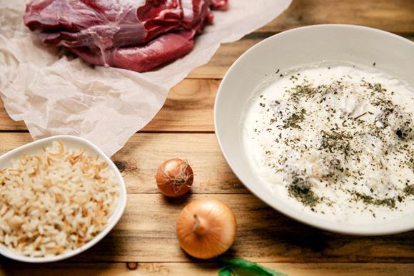4 μεγάλα κρεμμύδια 2 αυγά 1 κιλό μοσχαρίσιο ποντίκι 1,5 κιλό πρόβειο γιαούρτι 0,5 κιλό αγελαδινό γιαούρτι Ελαιολαδο Βούτυρο Αλάτι Πιπέρι μαύρο Πιπέρι λευκό 5-6 σπυριά κάρδαμο 5-6 σπυριά μπαχάρι 2-3 γαρύφαλα Τζιντζερ σε σκόνη Δυοσμο ξερό Ρύζι για το σερβιρισμα