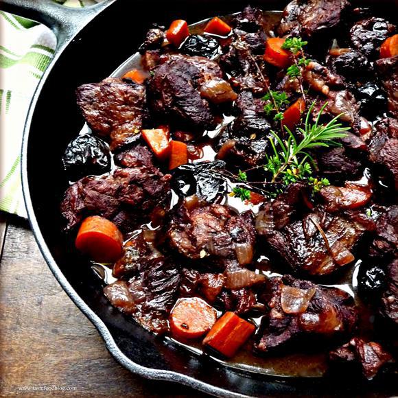 Βγάζουμε το κρέας από τη μαρινάτα και το σκουπίζουμε καλά ώστε να είναι εντελώς στεγνό. Το αφήνουμε σε θερμοκρασία δωματίου να ζεσταθεί. Σε μία πλατιά κατσαρόλα ζεσταίνουμε το λάδι και σοτάρουμε το κρέας μέχρι να κάνει κρούστα. Στη συνέχεια το σβήνουμε με το κρασί και προσθέτουμε τα υπόλοιπα υλικά. Το αφήνουμε να πάρει βράση και μετά χαμηλώνουμε τη φωτιά. Θέλει περίπου 3 ώρες μέχρι να γίνει τρυφερό.