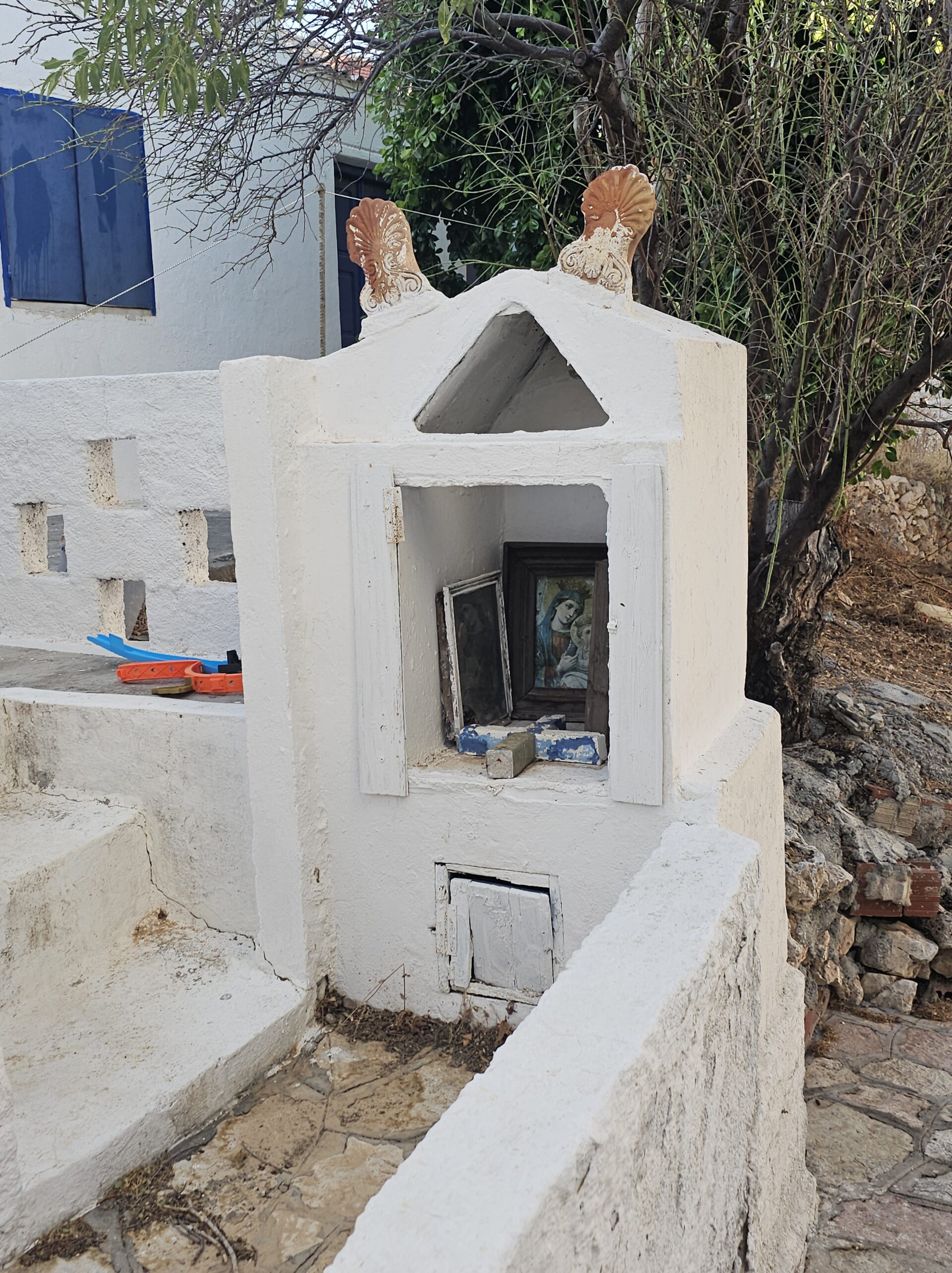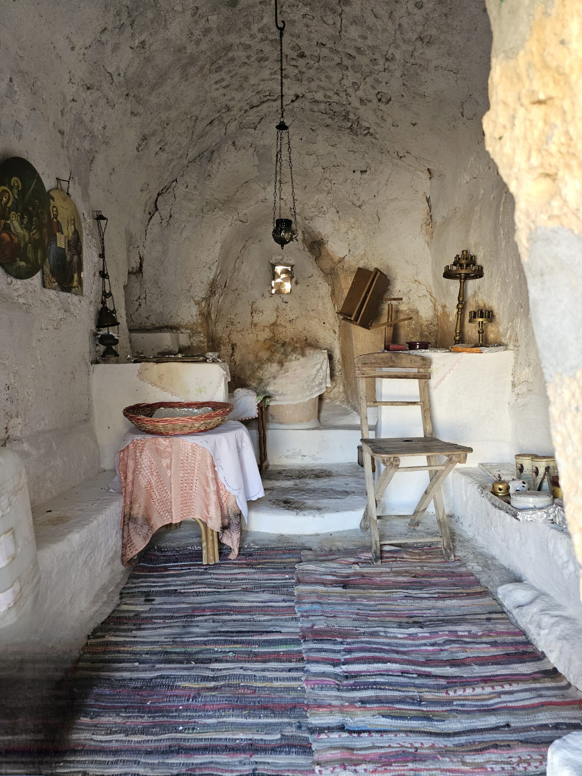 Στο πάνω μέρος του εγκαταλειμμένου οικισμού συναντάμε τους θρόνους του Δία και της Εκάτης, δύο θέσεις λαξευμένες πάνω στο φυσικό βράχο ελληνιστικής περιόδου που έχουν χαραγμένη στο κάτω μέρος τους την αρχαία επιγραφή «Διός Ἑκάτ[ης]» και ερμηνεύονται ως θρόνοι ή βωμοί με ενδεχομένο αποτροπαϊκό χαρακτήρα.