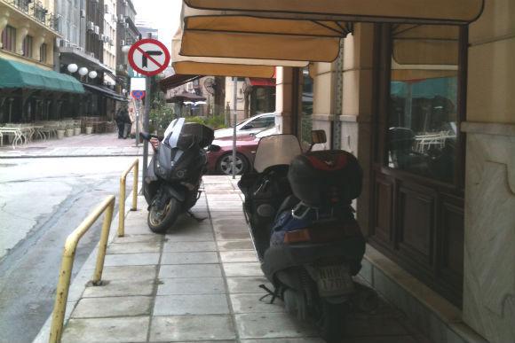 Στη διάβαση επάνω είναι παρκαρισμένο ένα αυτοκίνητο. Ακριβώς μπροστά του παρκάρει ένας κύριος το δικό του (μεγάλο) αυτοκίνητο. Πέρα από το ότι κλείνει εντελώς το πεζοδρόμιο, ακριβώς στο φανάρι, κλείνει και τον μισό δρόμο προς την άνοδο για την προέκταση της Μητροπόλεως. Του κάνω νόημα να μην παρκάρει γιατί εμποδίζει. Δεν δίνει σημασία και παρκάρει. Πλησιάζω και του λέω οτι οι πεζοί δεν μπορούν να περάσουν τώρα απο τη διάβαση. Κι εκεί αρχίζει το ωραίο πανηγυράκι, “…και ποιά είσαι εσύ που θα μου πείς που να παρκάρω;”, “εγώ είμαι πεζή και μ’ εμποδίζετε”, “άντε παράτα μας απο δώ”, “είστε ξεφτιλισμένος” του απαντώ εγώ, κόσμος πάει κι έρχεται, ο τύπος κοιτάζει γύρω του για να δει αν παρακολουθούν οι περαστικοί, ένας ηλικιωμένος έχει σταματήσει και ακούει την ανταλλαγή φιλοφρονήσεων…”Ετσι πως είσαι, εσύ είσαι ξεφτίλα” μου λέει. “Πολύ καλά, καθίστε εκεί να σας βγάλω μια φωτογραφία”, βγάζω το κινητό μου και τον φωτογραφίζω. Απευθύνεται στον μοναδικό θεατή και του λέει “είναι οι καινούριοι μπάτσοι αυτοί, αυτό κάνουν τώρα”. Ο ηλικιωμένος κύριος κουνάει το κεφάλι του σα να θέλει να με μαλώσει και μου λέει “έχει δίκιο, δεν έχετε δικαίωμα να του πείτε πού να παρκάρει, παραφέρεστε”. Τον σιχτίρισα. Ένας βρέθηκε να είναι μπροστά και πήρε το μέρος του παράνομου! Με έπνιξε το δίκιο εκείνη την ώρα, δεν έπρεπε να του μιλήσω έτσι αλλά μ’ έβγαλε απ’ τα ρούχα μου. Φτάνοντας στην Καλαποθάκη, φάτσα-κάρτα πάνω στο πεζοδρόμιο, δυό μοτοσυκλέτες κουκλίτσες παρκαρισμένες κανονικά. Εεε, λέω, δεν είναι η μέρα της χαράς μόνο αλλά κι η μέρα των καινούριων μπάτσων. Κι έστειλα τις δυό φωτογραφίες στον Γιώργο τον Τούλα και κάπως αισθάνθηκα οτι αυτοί που νοιάζονται θα δουν και θα καταλάβουν.