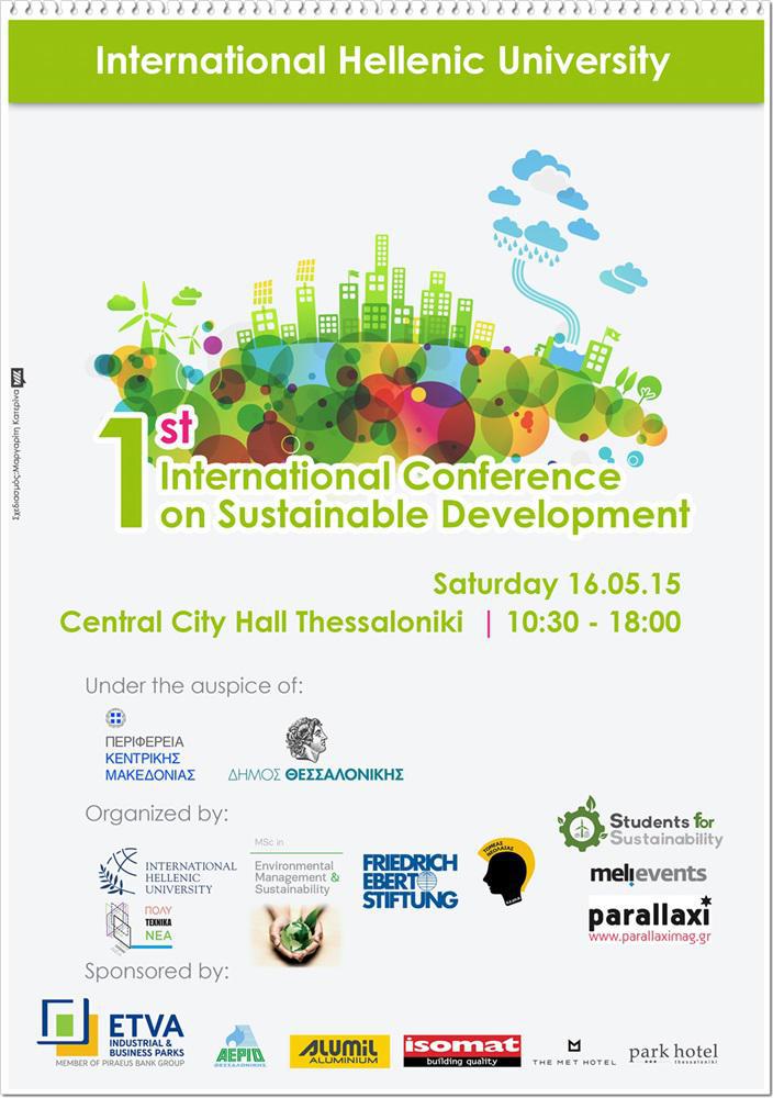 Επειδή αυτή η πραγματικότητα σε άλλες χώρες είναι περισσότερο εμφανής και σε άλλες λιγότερο, όπως για παράδειγμα στη χώρα μας, εμείς ως όμαδα νέων επιστημόνων και στα πλαίσια της ατομικής κοινωνικής ευθύνης, μέσω της ομάδας μας «Students for Sustainability» αποφασίσαμε να κάνουμε μία αρχή στο θέμα της βιώσιμης ανάπτυξης. Και κάπως έτσι γεννήθηκε το 1ο Διεθνές Συνέδριο για τη Βιώσιμη Ανάπτυξη (το πρώτο του είδους του στη χώρα μας) το οποιο θα πραγματοποιηθεί στις 16 Μαϊου 2015 στην αίθουσα Δημοτικού Συμβουλίου στο Δημαρχιακό Μέγαρο Θεσσαλονίκης, από τις 10:30 έως τις 18:00. Στην ουσία το συγκεκριμένο συνέδριο διοργανώνεται από την ομάδα φοιτητών «Students for Sustainability» του Μεταπτυχιακού Προγράμματος Περιβαλλοντικής Διαχείρισης και Βιωσιμότητας του Διεθνούς Πανεπιστημίου της Ελλάδος (MSc in Environmental Management & Sustainability). Στη διοργάνωση συμμετέχει ο Δήμος Θεσσαλονίκης, η Μη-Κυβερνητική Οργάνωση Friedrich Ebert Stiftung, το ελληνικό παράρτημα του Club of Rome και ο Διεθνής Οργανισμος Βιοπολιτικής ενώ τελεί υπό την αιγίδα της Περιφέρειας Κεντρικής Μακεδονίας.