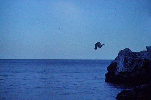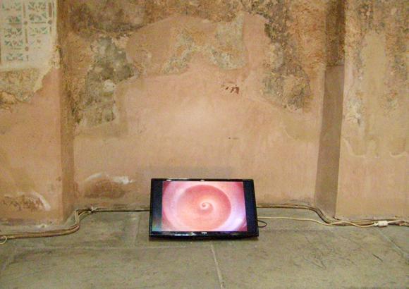 Μέσα στα επόμενα 10΄ η εθελόντρια, με μεγάλη προθυμία, μου έκανε μια μίνι ξενάγηση στον υπόλοιπο χώρο. Εικαστικές εγκαταστάσεις – οθόνες κυρίως, παρουσίαζαν με τη σειρά το σύμβολο της σπείρας, την έννοια του αέναου, όπως την αντιλαμβάνεται και την έχει επεξεργαστεί ο Αλέξανδρος Κακλαμάνος, στο πλαίσιο της έκθεσης. «Το συγκεκριμένο έργο αρχικά με άγχωνε», μου ανέφερε η κοπέλα, «μέχρι που κάποιος μου είπε: μα… έχει καταργήσει το νόμο της βαρύτητας!». Ήθελε λίγη ώρα, για να αντιληφθείς ότι η μορφή που φαινομενικά πραγματοποιούσε βουτιά σε γαλάζια νερά από ένα βράχο, στην ουσία περιστρεφόταν γύρω από τον εαυτό της, σε μια αέναη κίνηση που… δεν είχε τελειωμό!