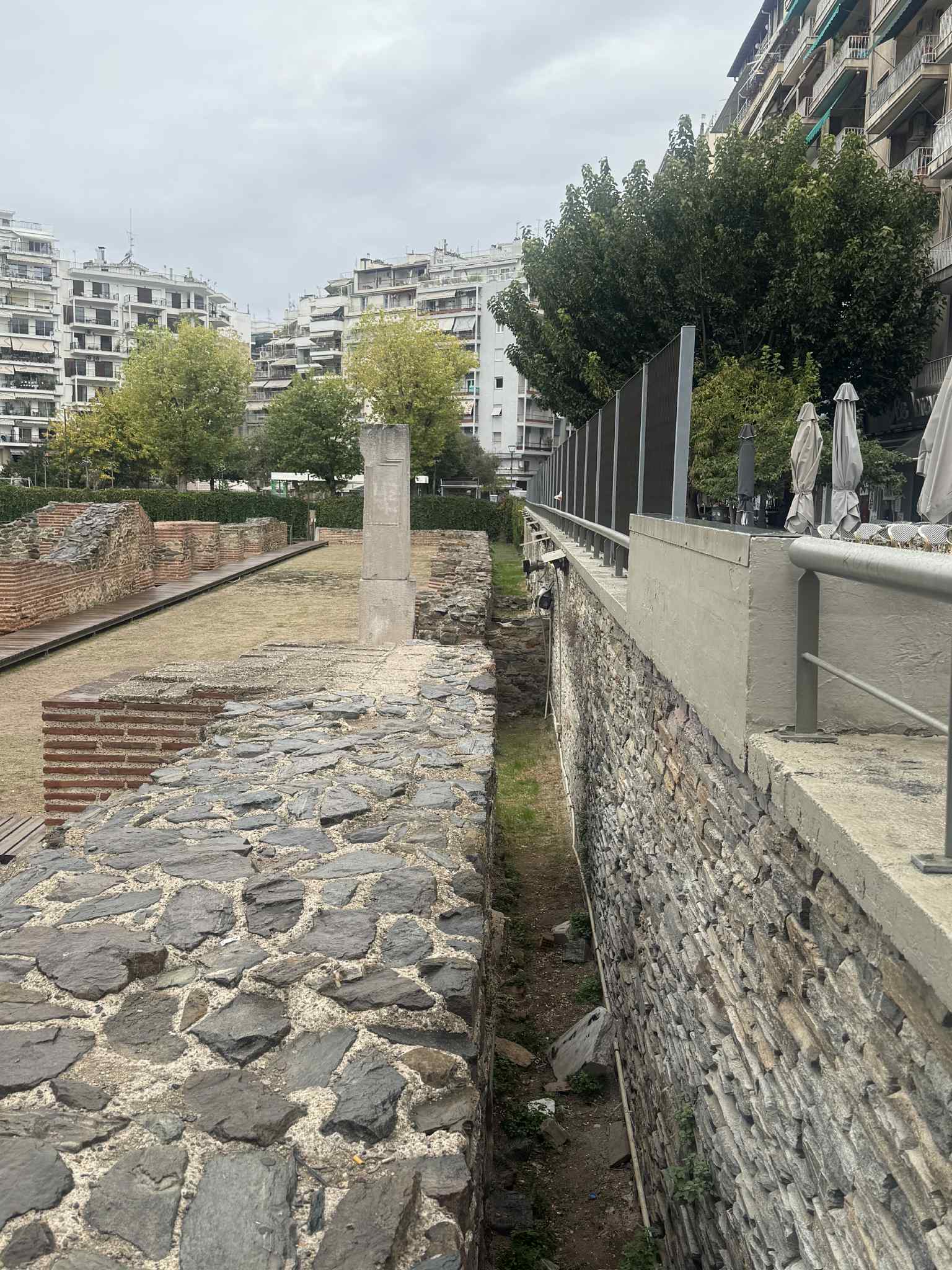 Μια δεύτερη παρατήρηση είναι πως στο συγκεκριμένο χώρο τα κάγκελα μπορούσαν απλά να τοποθετηθούν ανάμεσα στο αρχαίο τείχος και το σύγχρονο τοιχάκι όπως βλέπετε στην εικόνα. Η δουλειά θα γινόταν μια χαρά και δεν θα δημιουργούσε διακοπή της οπτικής συνέχειας. Θα ήταν σε χαμηλότερο ύψος και δεν θα απέκρυπταν το μνημείο από τη δημοφιλέστερη πλευρά της πλατείας.