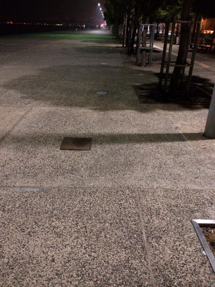 Στη φωτογραφία του κ. Τσουκαλά φαίνεται ότι ο επιδαπέδιος φωτισμός της Παραλίας (στο κομμάτι μεταξύ Ομίλου και Μεγάρου) παραμένει σβηστός από την ημέρα του ατυχήματος ένα χρόνο πριν, χωρίς να έχει γίνει καμιά προσπάθεια επιδιόρθωσης της κακοτεχνίας.