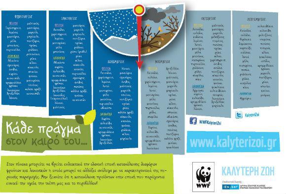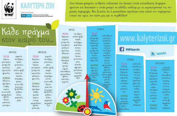 Η Καλύτερη Ζωή, η νεα πρωτοβουλία του WWF Ελλάς για τη βελτίωση της καθημερινότητας των πολιτών, μοιράζεται εδώ μαζί σας έναν πρακτικό πίνακα με την εποχικότητα φρούτων και λαχανικών τον οποίο και μπορείτε να αναρτήσετε στο ψυγείο σας. Έτσι, θα γίνετε ειδικοί στο πότε τρώμε τι και σταδιακά θα καταφέρετε να γεμίσετε το καλάθι των αγορών σας με εποχικά και τοπικά τρόφιμα. Καλή αρχή με χρώμα, γεύση και ποικιλία στο τραπέζι σας!
